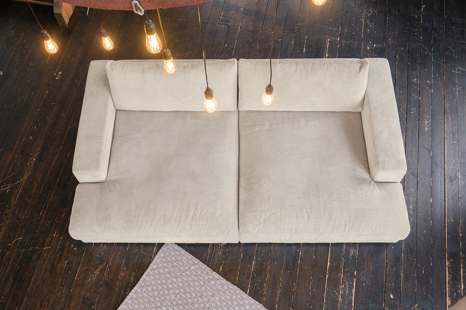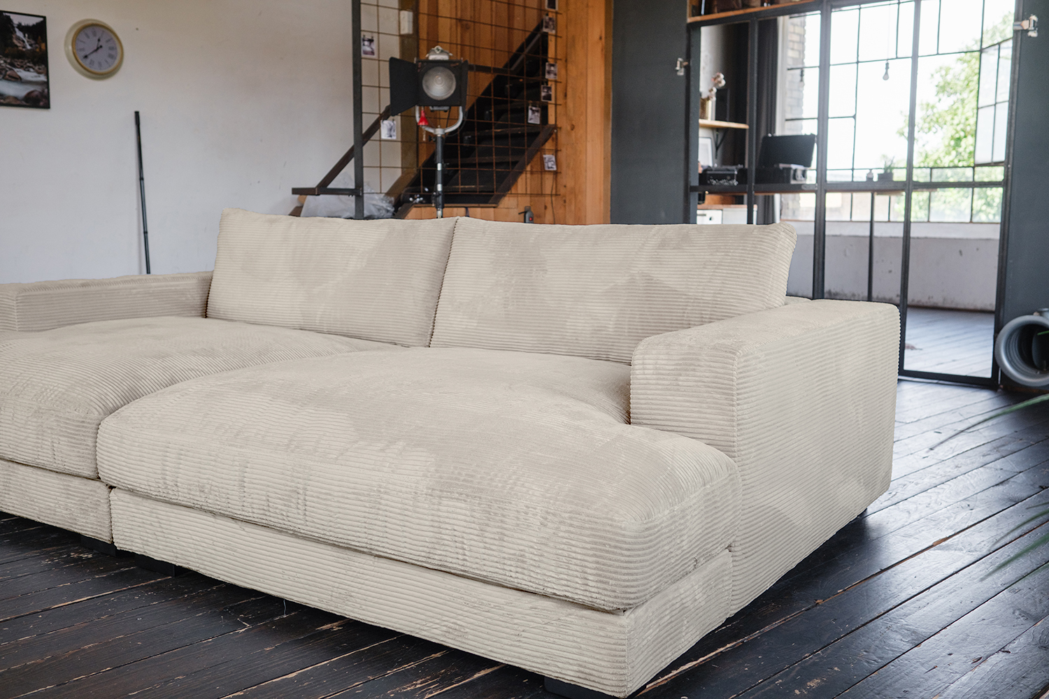 Das einladende Big Sofa MADELINE verwandelt Ihr Zuhause in eine Wohlfühloase. Das XXL Sofa im modernen Design bietet mit seiner großzügigen Fläche ausreichend Platz für entspannte Stunden mit Familie und Freunden. Der Bezug aus weichem Cordstoff sorgt für ein angenehmes Gefühl und verleiht dem Cordsofa eine elegante Note. Die legere Polsterung des Big Sofa Cord passt sich optimal der Körperform an und bietet hervorragenden Komfort. Genießen Sie entspannte Abende auf diesem modernen Sofa. Das Big Sofa ist nicht nur bequem, sondern auch ein echter Hingucker in jedem Wohnzimmer. Seine schlichte Eleganz und die hochwertige Verarbeitung machen es zu einem langlebigen Begleiter. Ob als zentraler Treffpunkt für gesellige Runden oder als gemütlicher Rückzugsort zum Entspannen – dieses XXL Sofa erfüllt alle Wünsche. Das Cordsofa fügt sich harmonisch in verschiedene Einrichtungsstile ein und verleiht jedem Raum eine besondere Note. Das moderne Sofa ist die perfekte Wahl für alle, die Wert auf Komfort, Stil und Qualität legen. Gönnen Sie sich das besondere Wohngefühl mit diesem außergewöhnlichen Möbelstück.-