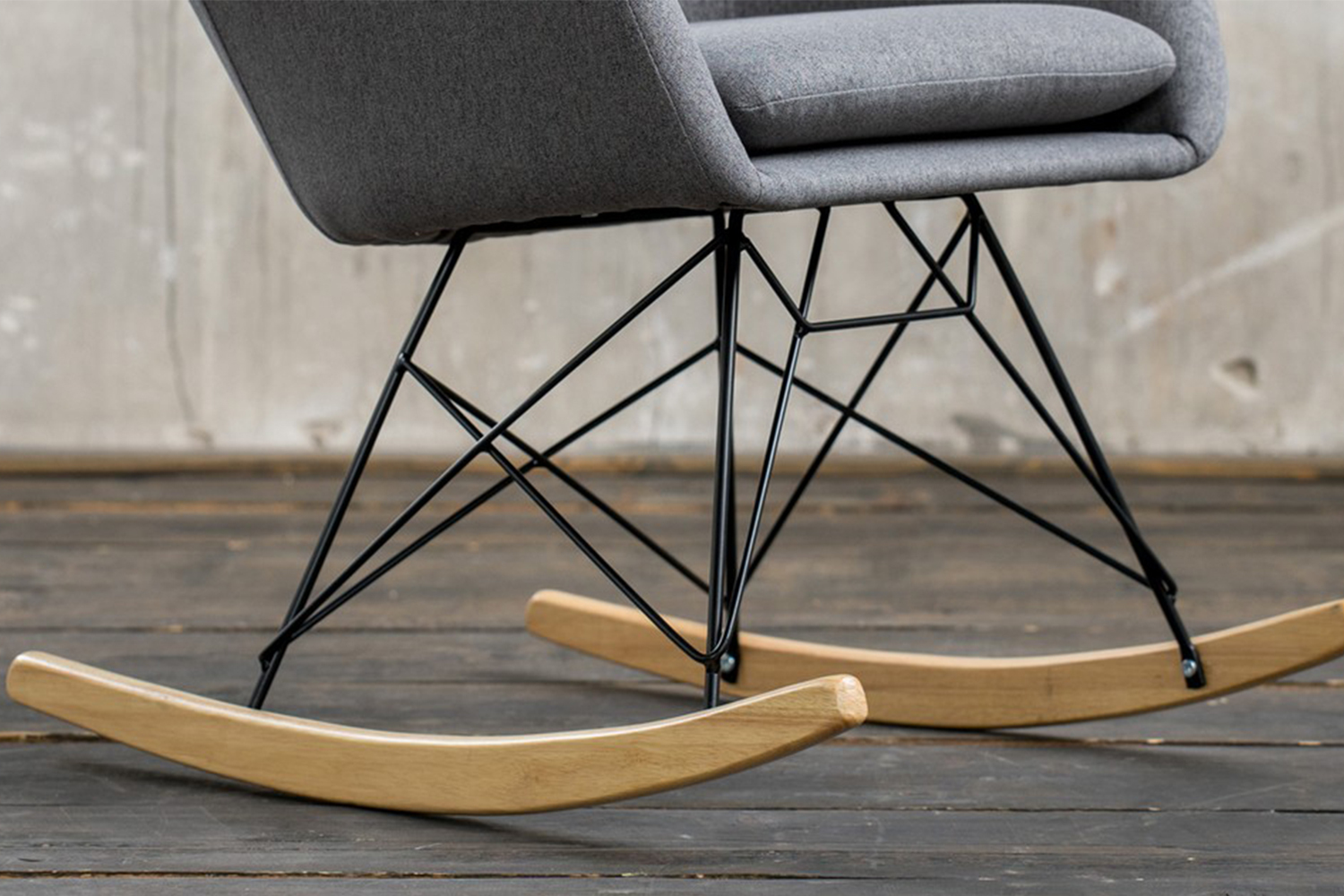 Das Gestell des Stuhl wurde aus Metall gefertigt und ist sehr robust und stabil. In einer schönen Ergänzung zum dem grauen Stoff und dem dunklen Metall wurden die Kufen aus Eiche gefertigt.