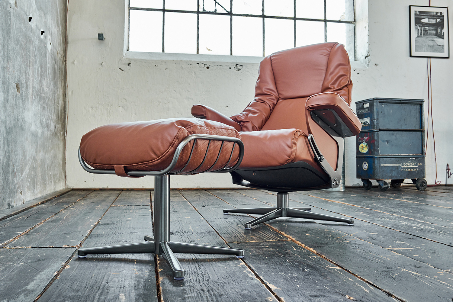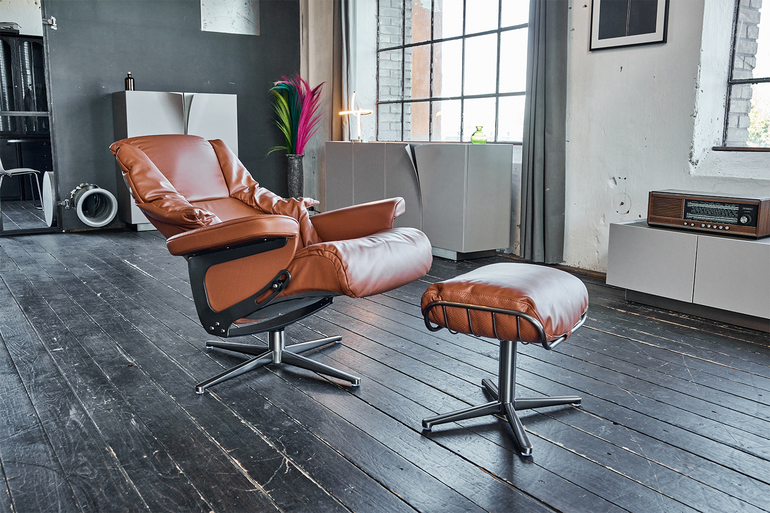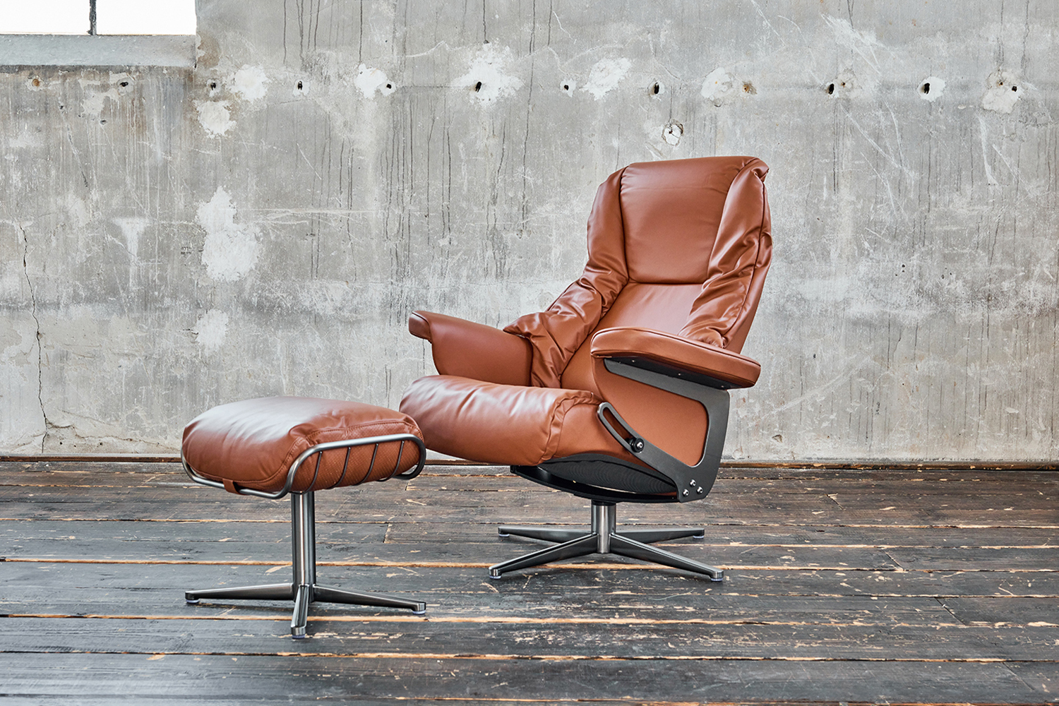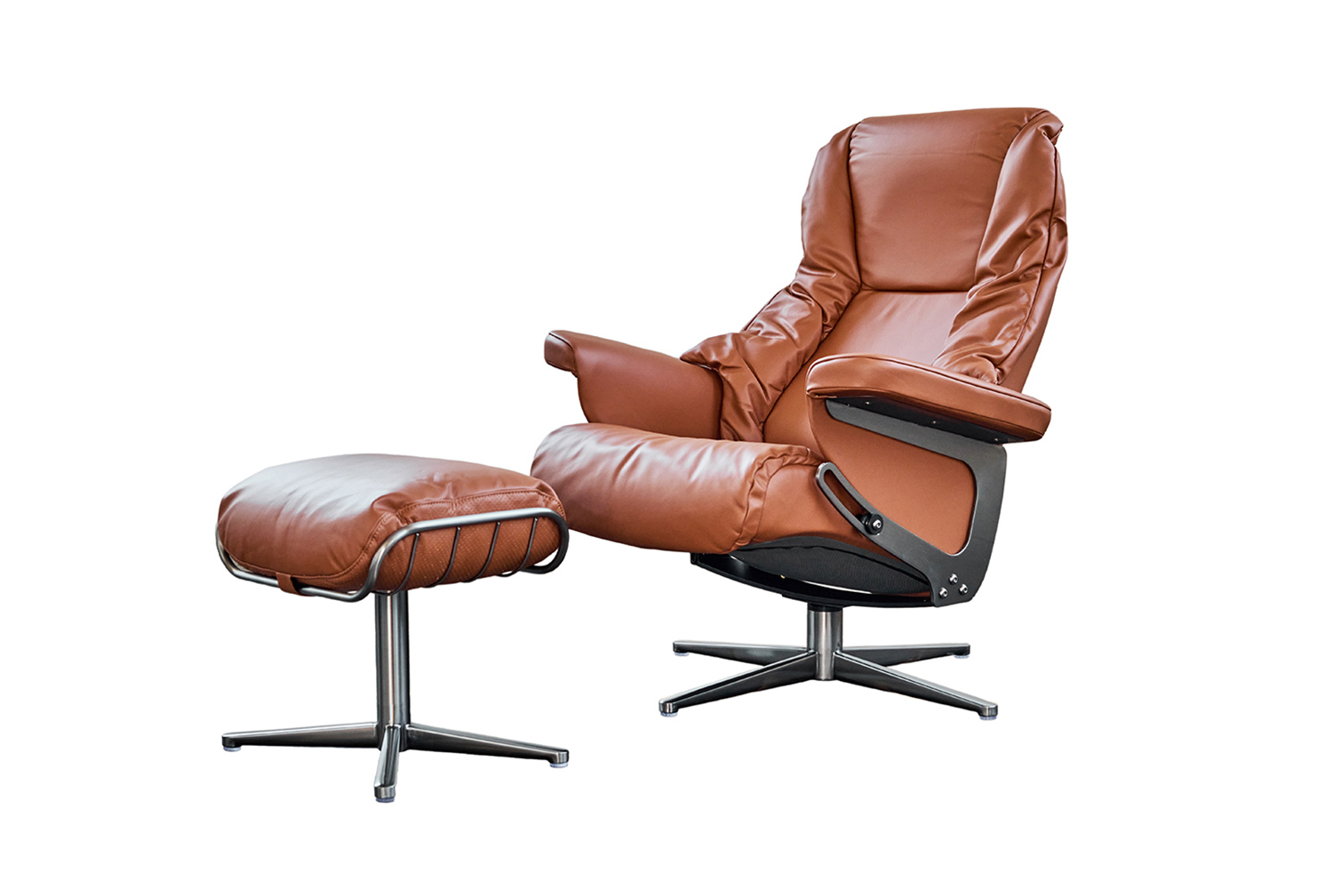 Die clevere Relaxfunktion ermöglicht durch manuelles Neigen der Rückenlehne maximale Entspannung. Ein passender Fußhocker hebt die Füße sanft an, für eine wohlverdiente Auszeit.