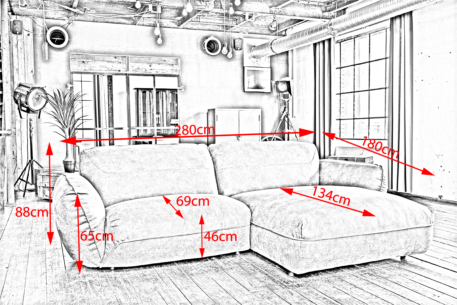 Sitztiefe: Sofa 69 cm / Recamiere 134 cm