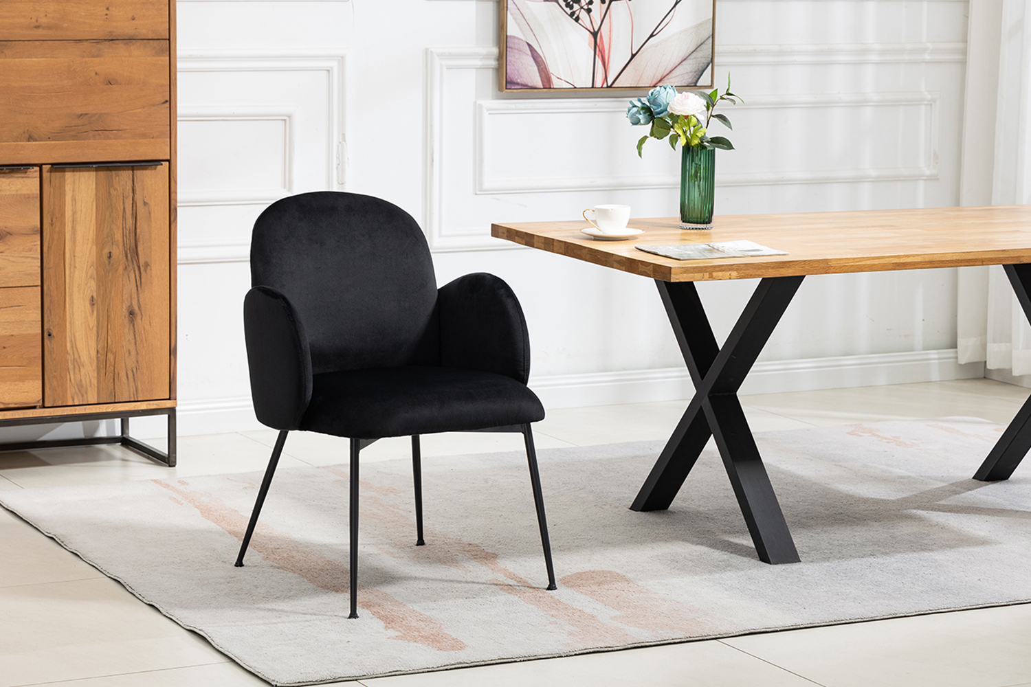 Neben seinem ansprechenden Design bietet der DEON Esszimmerstuhl herausragenden Sitzkomfort. Die geschwungenen Linien und gepolsterten Armlehnen unterstützen Ihre Körperhaltung, laden zu längeren Mahlzeiten und angeregten Gesprächen ein. Die pulverbeschichteten schwarzen Stahlbeine gewährleisten Stabilität und verleihen dem Stuhl eine moderne Ästhetik.