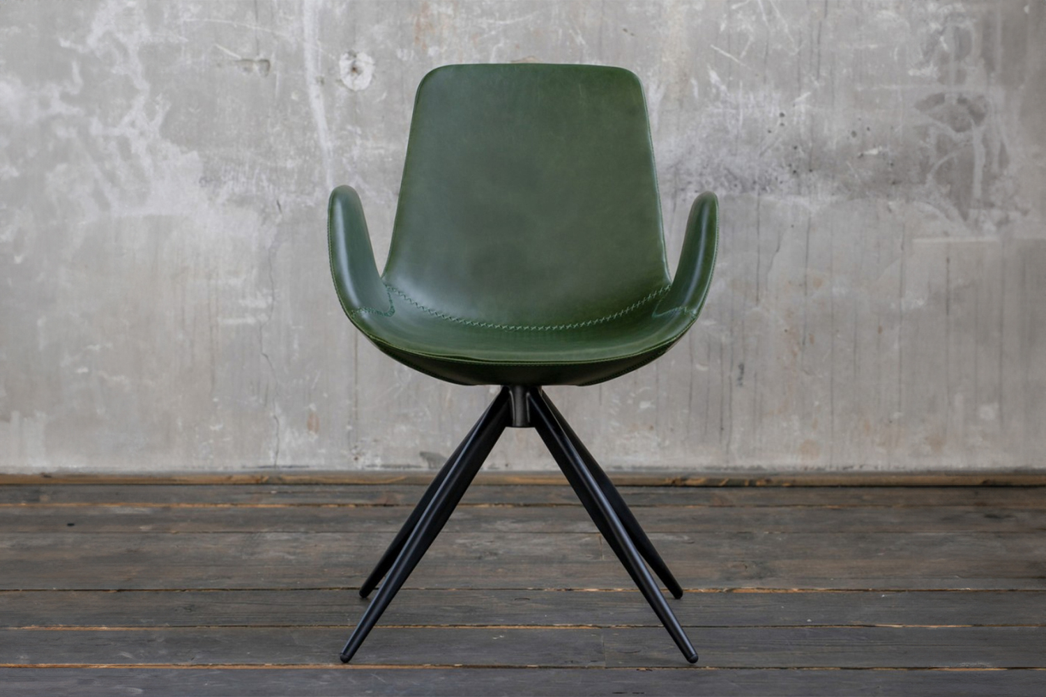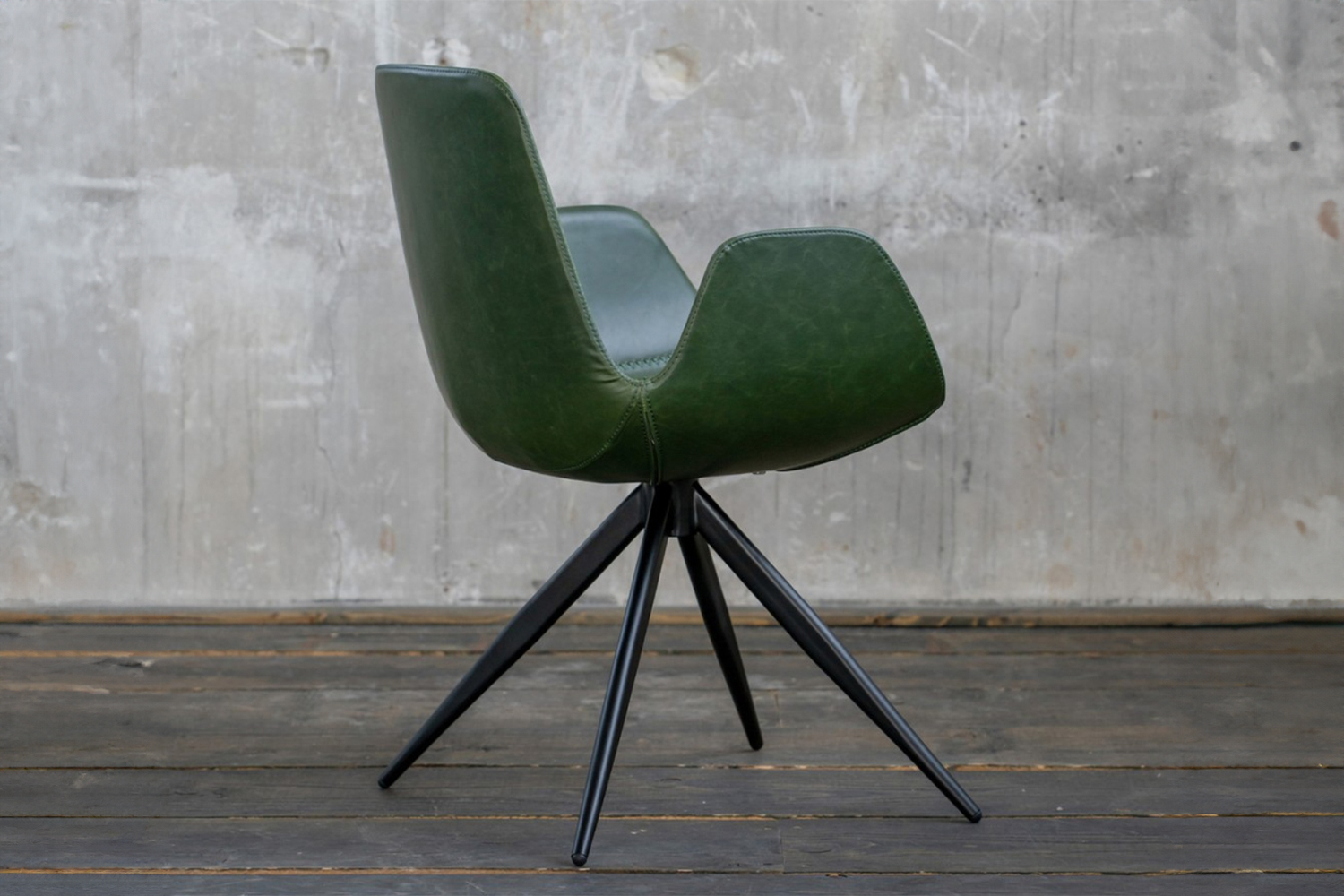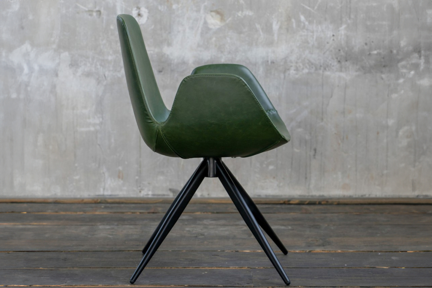 Die Sitzschale ist in einem strapazierfähigem Kunstleder bezogen welches vor allem durch die angenehme Haptik heraussticht. Die Füße des Stuhls haben die Farbe schwarz und setzen sich somit optimal von der modern geformten Sitzschale ab.