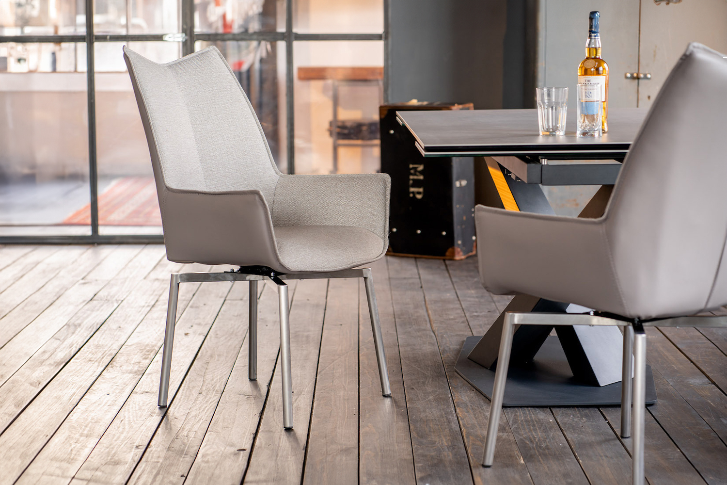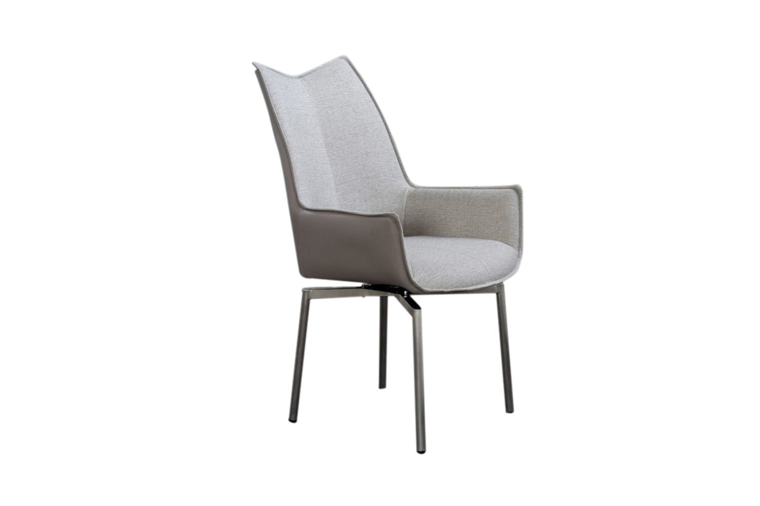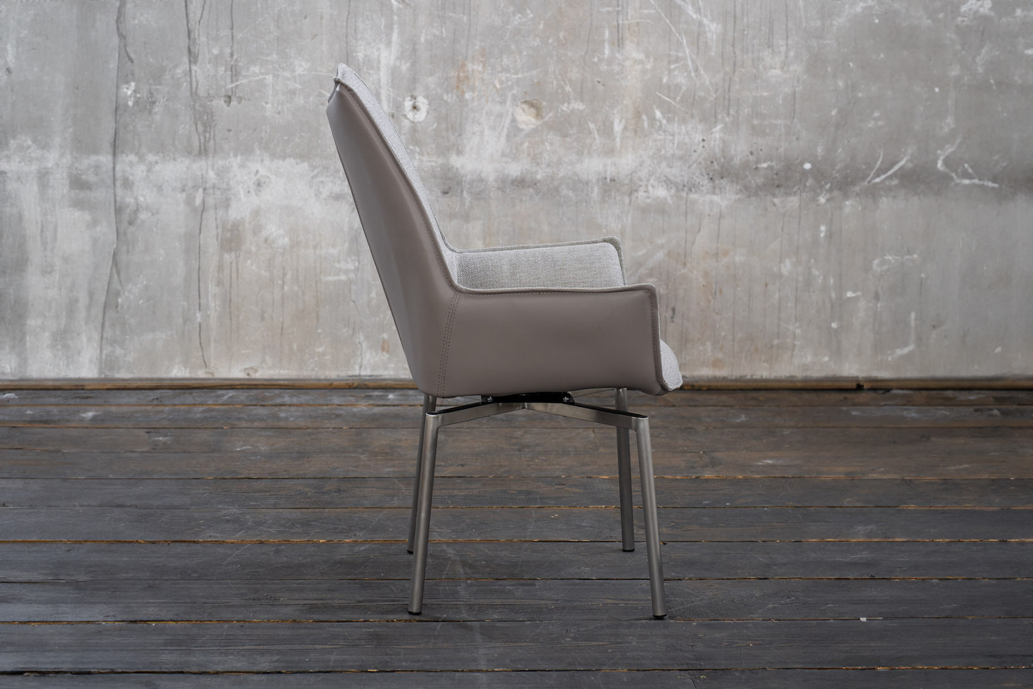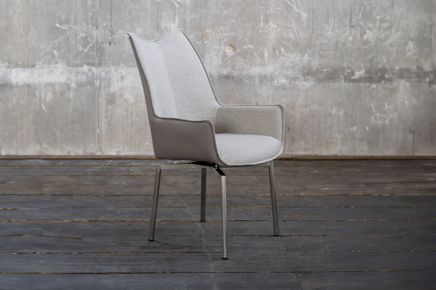 Der KAWOLA Esszimmerstuhl STINE begeistert durch hochwertige Verarbeitung und seine besondere Formsprache. Die Kombination des grauen Kunstleders an der Außenseite der Sitzschale und dem anschmiegsamen Stoff der Sitzfläche machen den Stuhl nicht nur Optisch zum Star eines jeden Essbereiches. Die eleganten Füße aus gebürstetem Edelstahl verfügen über eine Drehfunktion und runden den Stuhl perfekt ab. So ergibt sich ein stilvolles Gesamtbild. Form und Polsterung des Stuhls sorgen für einen angenehmen Sitzkomfort. Nicht nur im Esszimmer macht STINE eine tolle Figur, denn auch für den Objektbereich ist der Stuhl perfekt geeignet.