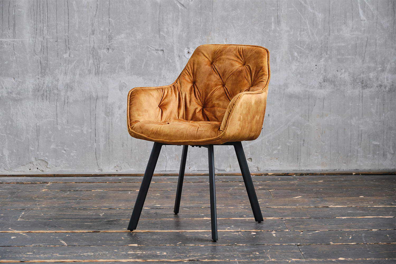 Der Stuhl XINA vereint industrielles und modernes Wohndesign. Hier können Sie sich bequem zurücklehnen und stilvoll speisen. Der Bezugsstoff aus Velvet ist sehr hochwertig verarbeitet und die aufwendige Absteppung verleiht dem Stuhl seinen besonderen Look. Ob im Büro oder im Esszimmer - der Stuhl XINA eignet sich aufgrund seines modernen Designs für praktisch jeden Wohnbereich.