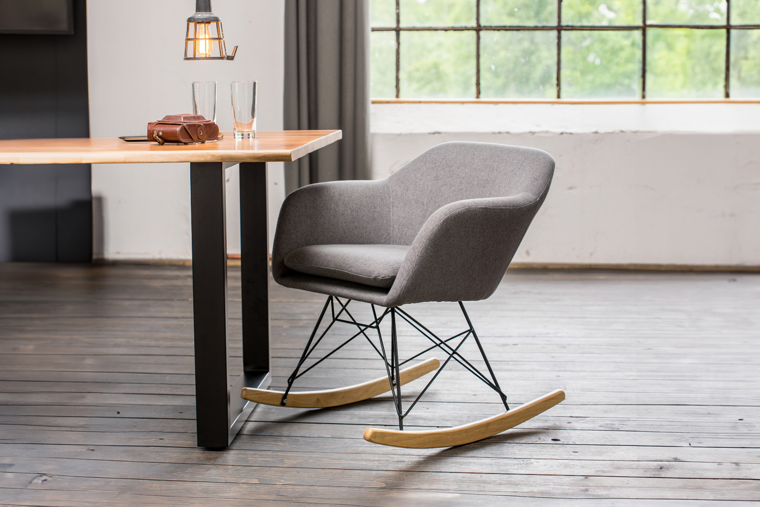 Das Gestell des Stuhl wurde aus Metall gefertigt und ist sehr robust und stabil. In einer schönen Ergänzung zum dem grauen Stoff und dem dunklen Metall wurden die Kufen aus Eiche gefertigt.