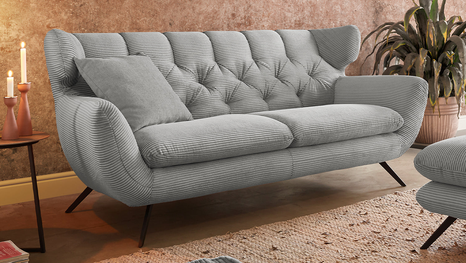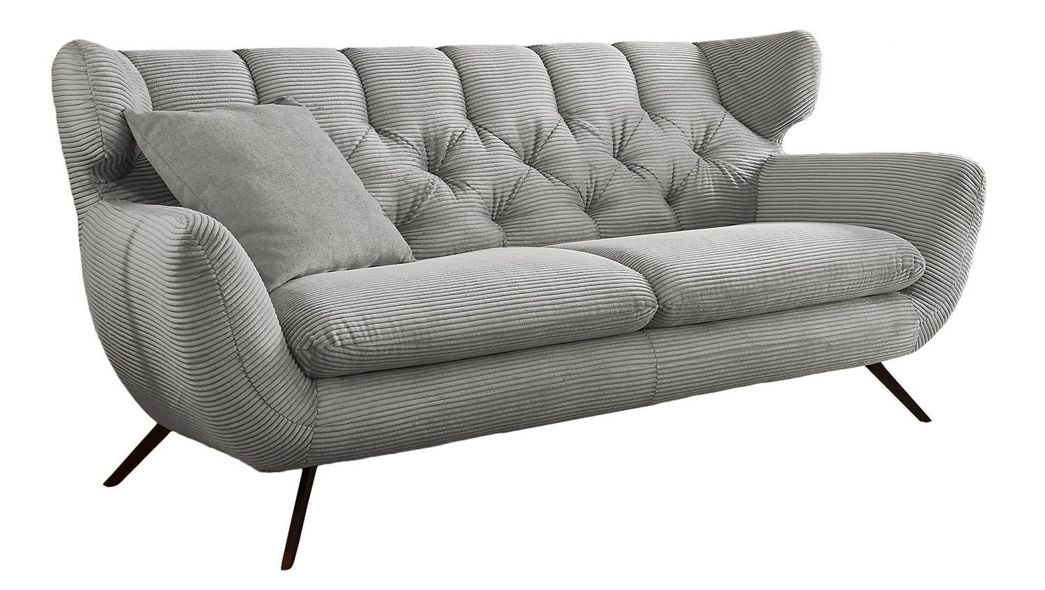 Das KAWOLA Sofa CHARME ist etwas ganz Besonderes! Es ist nicht nur ein Möbelstück, sondern ein wahres Design-Highlight, das neue Akzente im Wohnraum setzt. Der Stil des Sofas CHARME erinnert an die sechziger Jahre: Der Rücken wurde aufwendig abgesteppt ohne Knöpfe; die Rückenlehne wurde an den beiden Seiten leicht nach vorne gewölbt und erinnert an die Form eines Ohrensessels; die Füße aus Metall sind leicht ausgestellt. Die Polsterung des Sofas besteht aus PUR-Schaum und besticht durch ihren weichen und legeren Sitzkomfort. Die Sitzkissen passen sich der Körperform angenehm an. Selbstverständlich wurde das Sofa komplett in Cord bezogen, so dass es auch frei in den Raum gestellt werden kann. Wer nicht nur ein Sofa sucht, sondern ein ganz besonderes Highlight, der liegt mit dem KAWOLA Sofa CHARME goldrichtig!