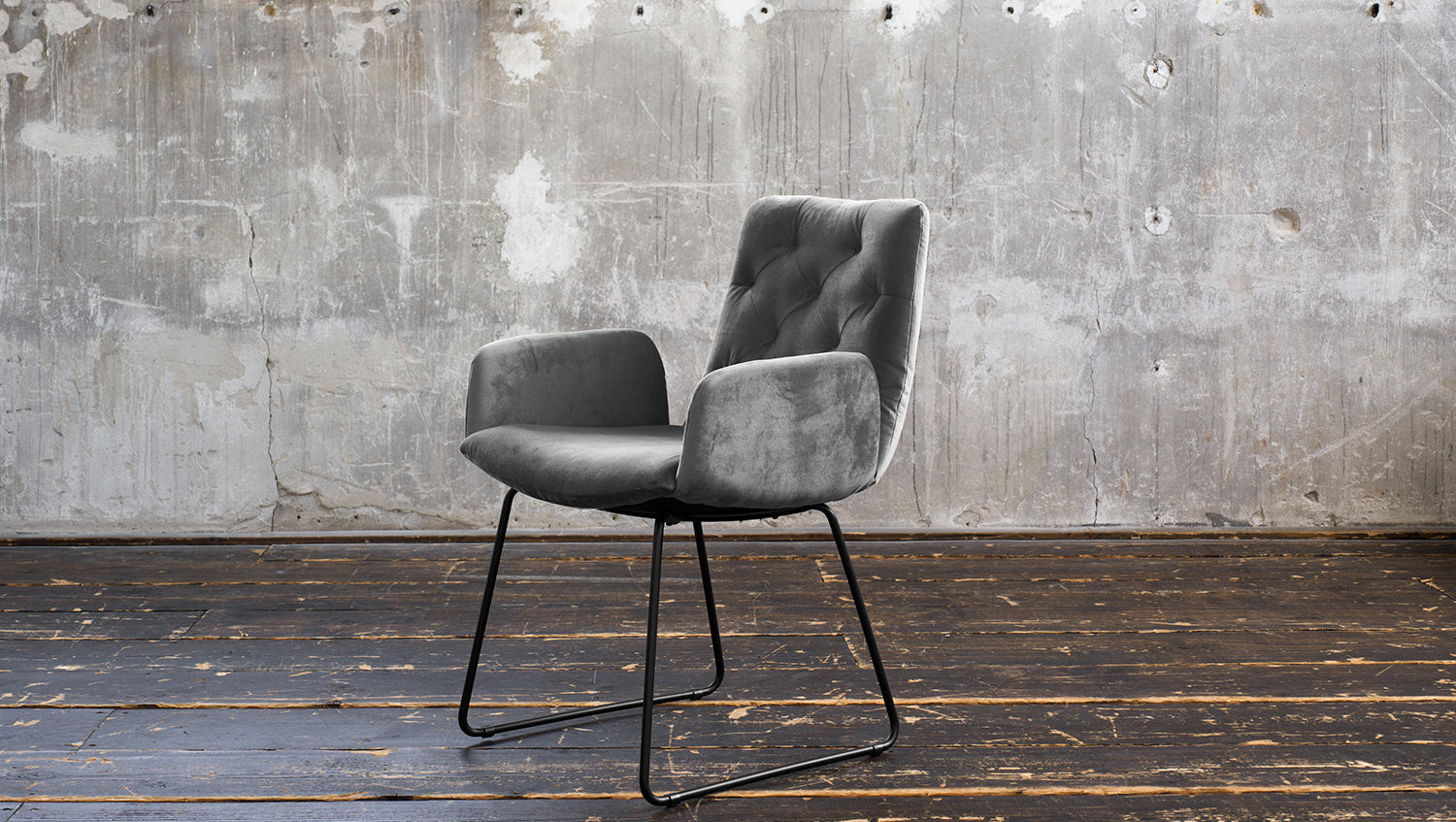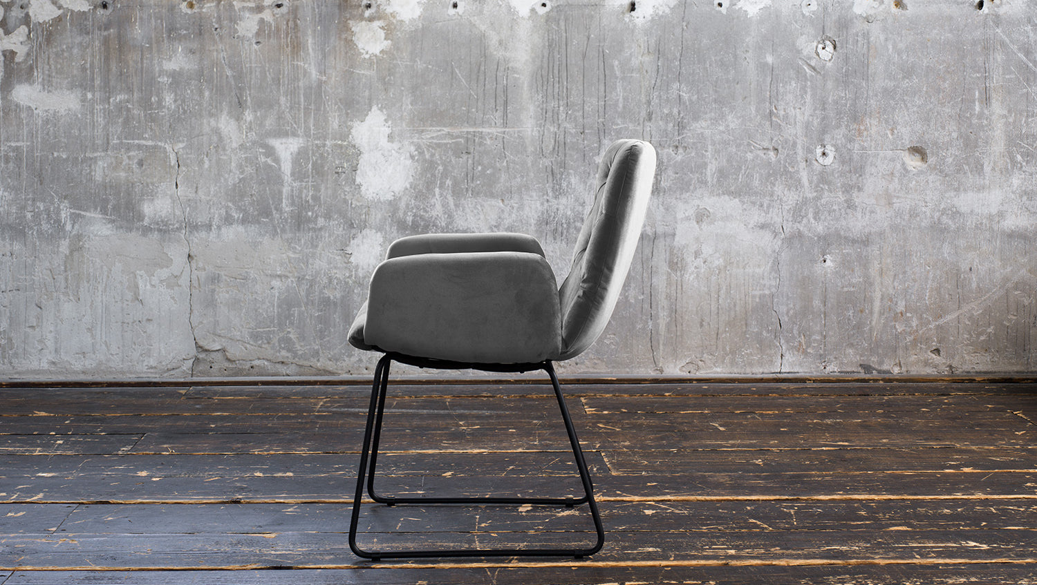 Der KAWOLA Esszimmerstuhl NEW CHARME ist nicht nur ein Möbelstück, sondern ein wahres Design-Highlight, das in Ihrem Zuhause neue Akzente setzt. Der Stil der Serie NEW CHARME erinnert an die Sechziger Jahre: Der Rücken wurde aufwendig abgesteppt ohne Knöpfe; die Rückenlehne wurde an den beiden Seiten leicht nach vorne gewölbt und erinnert an die Form eines Ohrensessels; die Kufenfüße aus Metall sind pulverbeschichtet. Zu der ausgefallenen Form des Stuhls NEW CHARME wurde hier der Bezug in angenehm weichem Velvet-Stoff gewählt. Wer nicht nur einen Esszimmerstuhl sucht, sondern einen zeitlos-stylischen Trendsetter, liegt mit der Serie NEW CHARME von KAWOLA goldrichtig!
