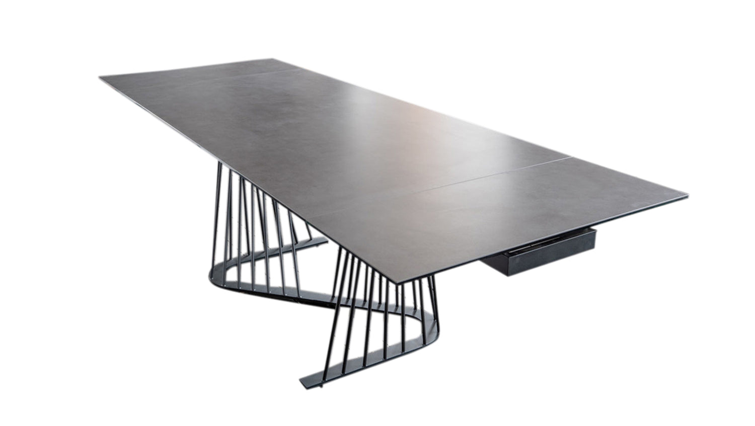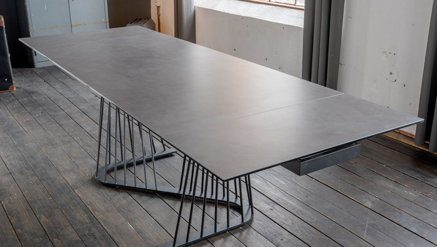 Der s-förmige Fuß aus dunklem Metall kontrastiert wunderbar mit der grauen Keramikplatte des Tischs. Durch die vielen Zwischenstreben gewinnt der Fuß an Leichtigkeit.