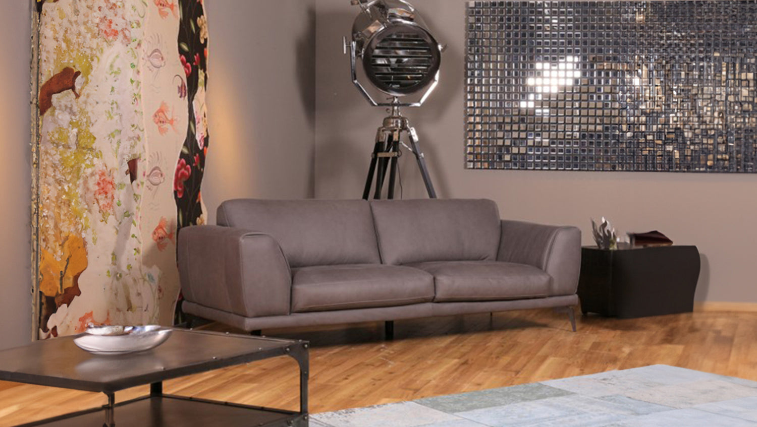 Das Modell Deside wurde komplett in Leder Pallino grau überzogen und lässt sich somit auch frei in den Raum stellen.