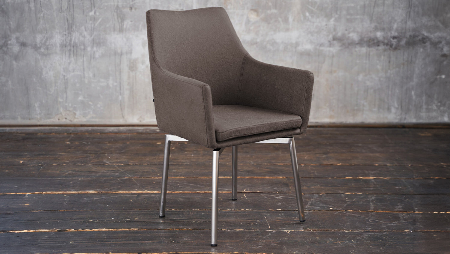 Das Gestell in Edelstahl harmonisiert hervorragend mit der Wahl des Bezuges und verleht dem Stuhl seinen modernen Charakter.