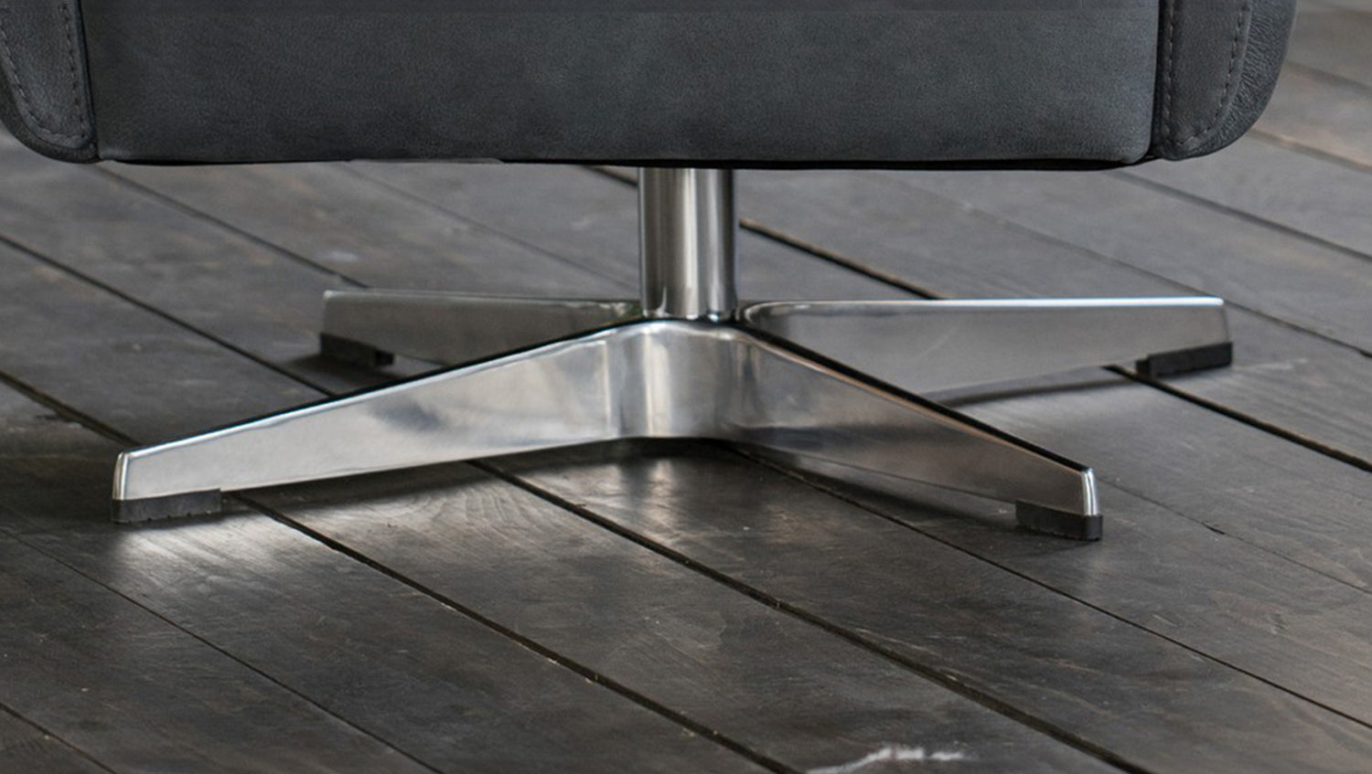 Der Drehsessel wurde komplett in einem wunderschönen schwarzen Leder überzogen, welches hervorragend zur Form und zur Wahl der Füße passt. Der Fuß wurde hier als Kreuzfuß Metall gefertigt.