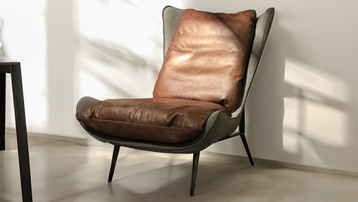 Sessel ERIO ist die perfekte Ergänzung für jeden Wohn- oder auch Wartebereich. Das Sitzpolster ist mit hochwertigem Vintage-Leder in braun bezogen, einen schönen Kontrast dazu bildet die mit Stoff bezogene Rückseite der Sitzschale. Das Gestell ist filigran gehalten und aus Metall gefertigt. Der Mix dieser verschiedenen Materialien komplettiert den besonderen Industrial-Look des Sitzmöbels.