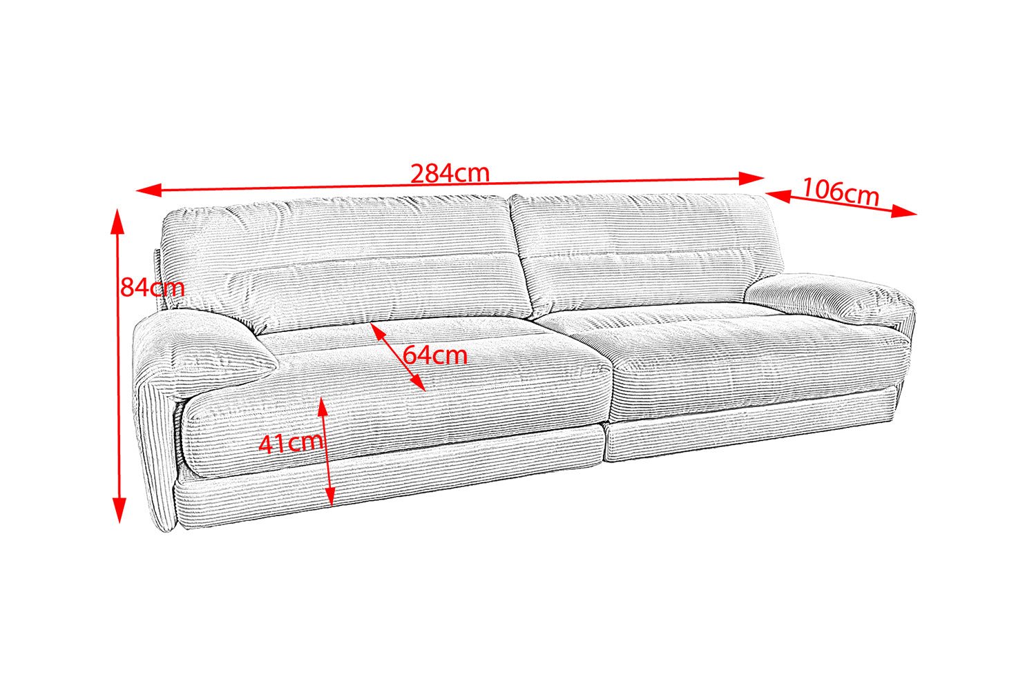 Mit einer großzügigen Breite von 284 cm bietet das Sofa ausreichend Platz für bis zu vier Personen, ideal für gesellige Zusammenkünfte mit Familie und Freunden. Der mittelfeste Sitzkomfort und eine Sitztiefe von 64 cm schaffen eine behagliche Atmosphäre, in der Sie sich entspannt zurücklehnen können.