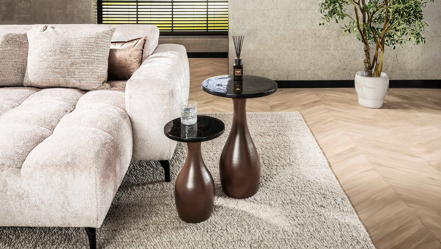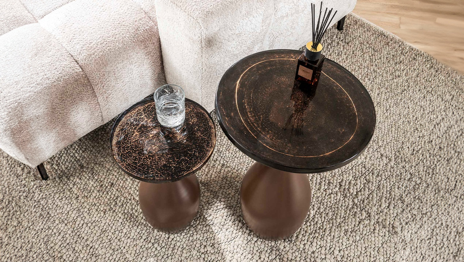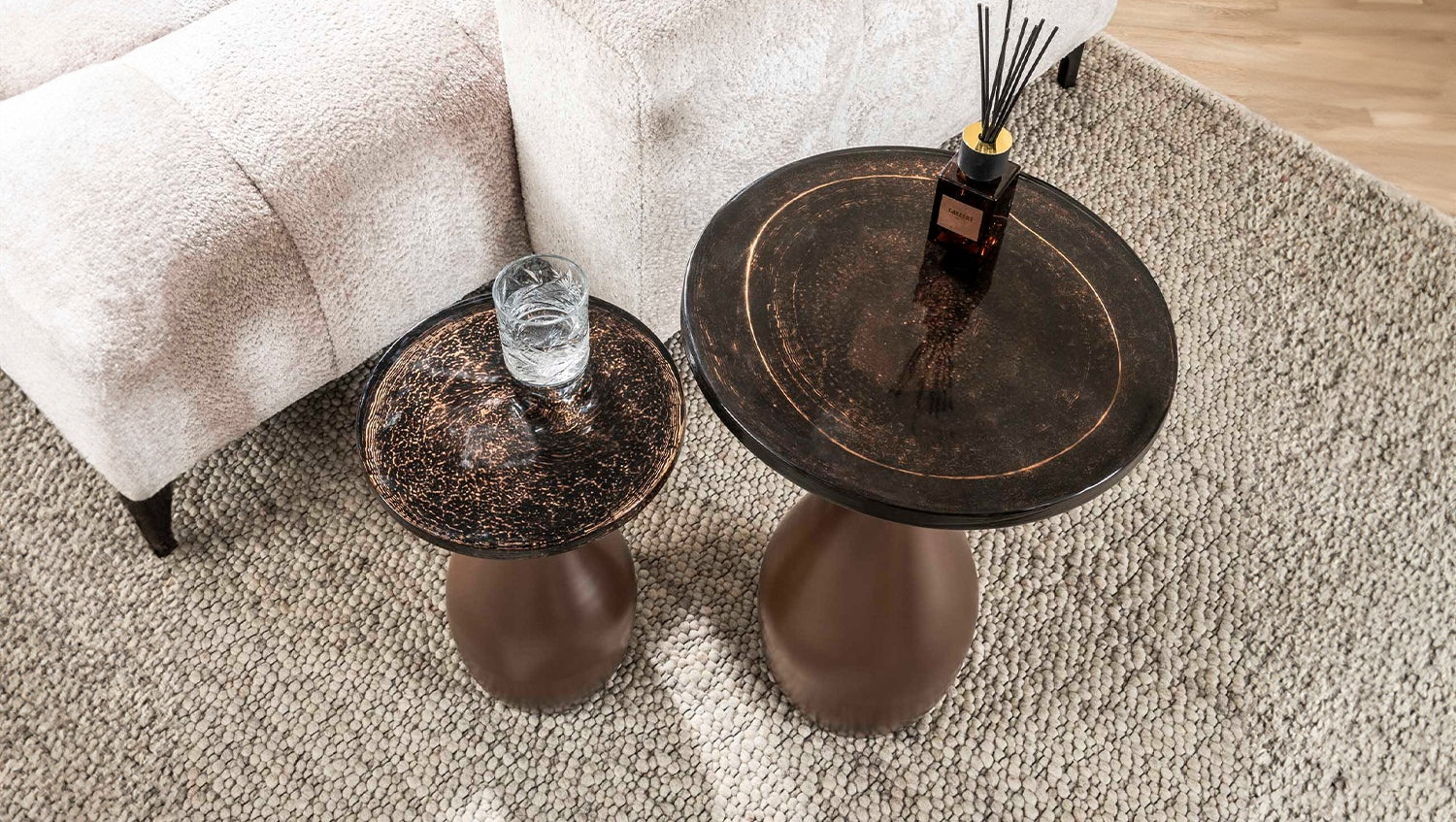 Der Beistelltisch MOKKA von KAWOLA vereint kunstvolles Design mit hochwertiger Handwerkskunst. Die tropfenförmige Silhouette des Gestells verleiht dem Tisch eine besonders elegante Ausstrahlung und macht ihn zu einem stilvollen Hingucker. Die Tischplatte aus gezogenem Glas begeistert mit ihrer leicht gewellten Oberfläche und kleinen, feinen Unregelmäßigkeiten, die den Charme traditioneller Glasherstellung widerspiegeln. Das farblich abgestimmte Metallgestell in Antikkupfer oder Antikgold setzt einen edlen Akzent und sorgt gleichzeitig für Stabilität. Durch seine kompakte Größe ist dieser Tisch ideal geeignet, um Getränke, Bücher oder Dekorationen geschmackvoll zu präsentieren. Ob als dekoratives Einzelstück oder als harmonischer Begleiter neben Sofa oder Sessel – dieser Beistelltisch bringt Stil und Charakter in jeden Raum.