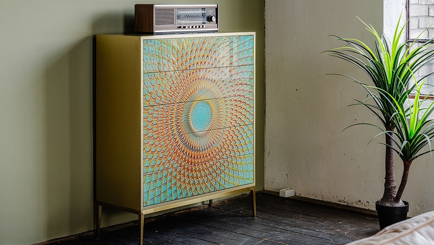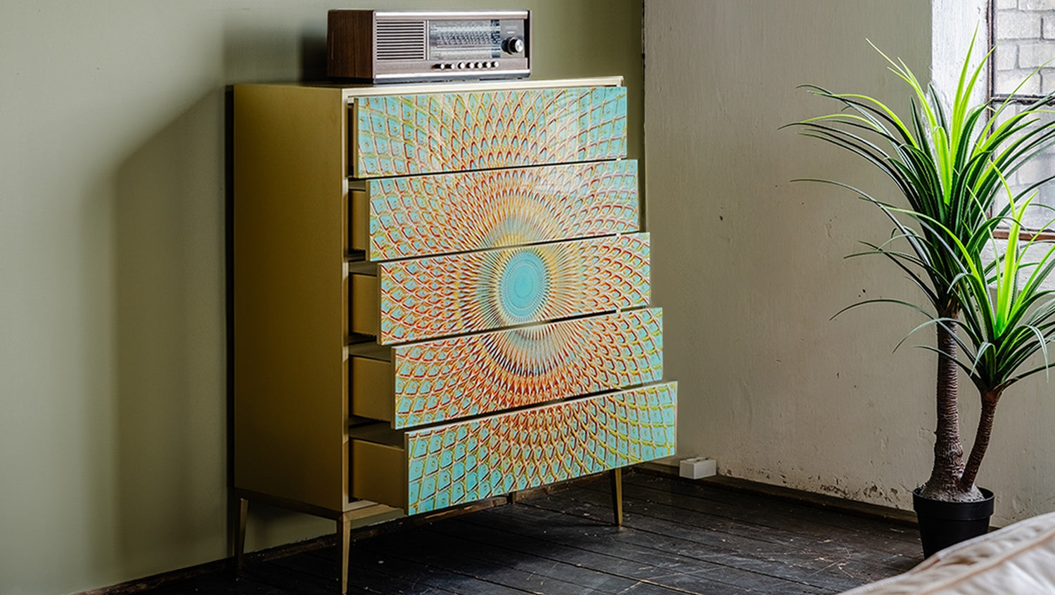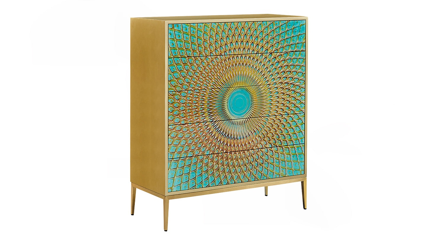Das KAWOLA Highboard LAGO besticht durch seine elegante Kombination aus ausgefallenem Design und praktischer Funktionalität. Die Schubladen sind mit Hartglas beschichtet und weisen goldfarbene Verzierungen auf, die die Form eines Pfauenauges ergeben. Die fünf Schubladen bieten großzügigen Stauraum und lassen sich dank des komfortablen Push-to-Open-Mechanismus mühelos öffnen. Die goldfarbenen Füße aus gebürstetem Edelstahl sorgen für einen modernen, zeitlosen Look und bieten gleichzeitig stabile Standfestigkeit. Das Highboard LAGO von KAWOLA fügt sich perfekt in jedes Wohnambiente ein und ist ideal für Liebhaber von außergewöhnlichen, eleganten Möbelstücken. Entdecken Sie die perfekte Kombination aus Design und Funktionalität mit dem Highboard LAGO!