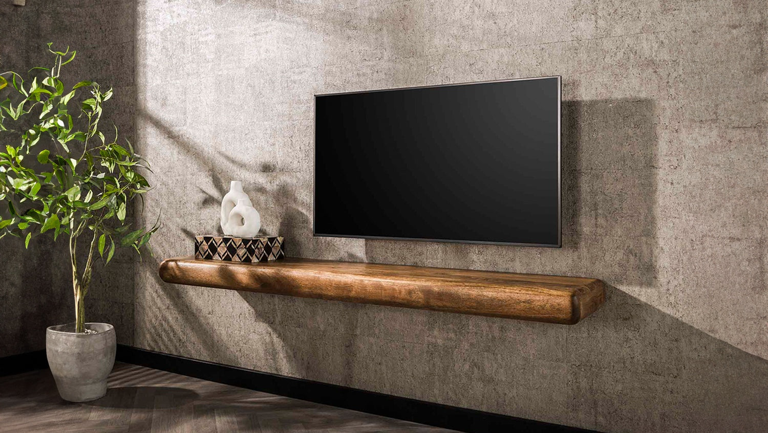 Das KAWOLA SWEAK 170 cm Wandregal ist aus hochwertigem Mangoholz mit sandfarbenem Finish gefertigt. Das Regal wird mit einer Latte und zwei Holzklötzen an der Wand befestigt, was eine feste und stabile Anbringung gewährleistet. Durch diese Konstruktion hängt das Regal schön flach an der Wand.