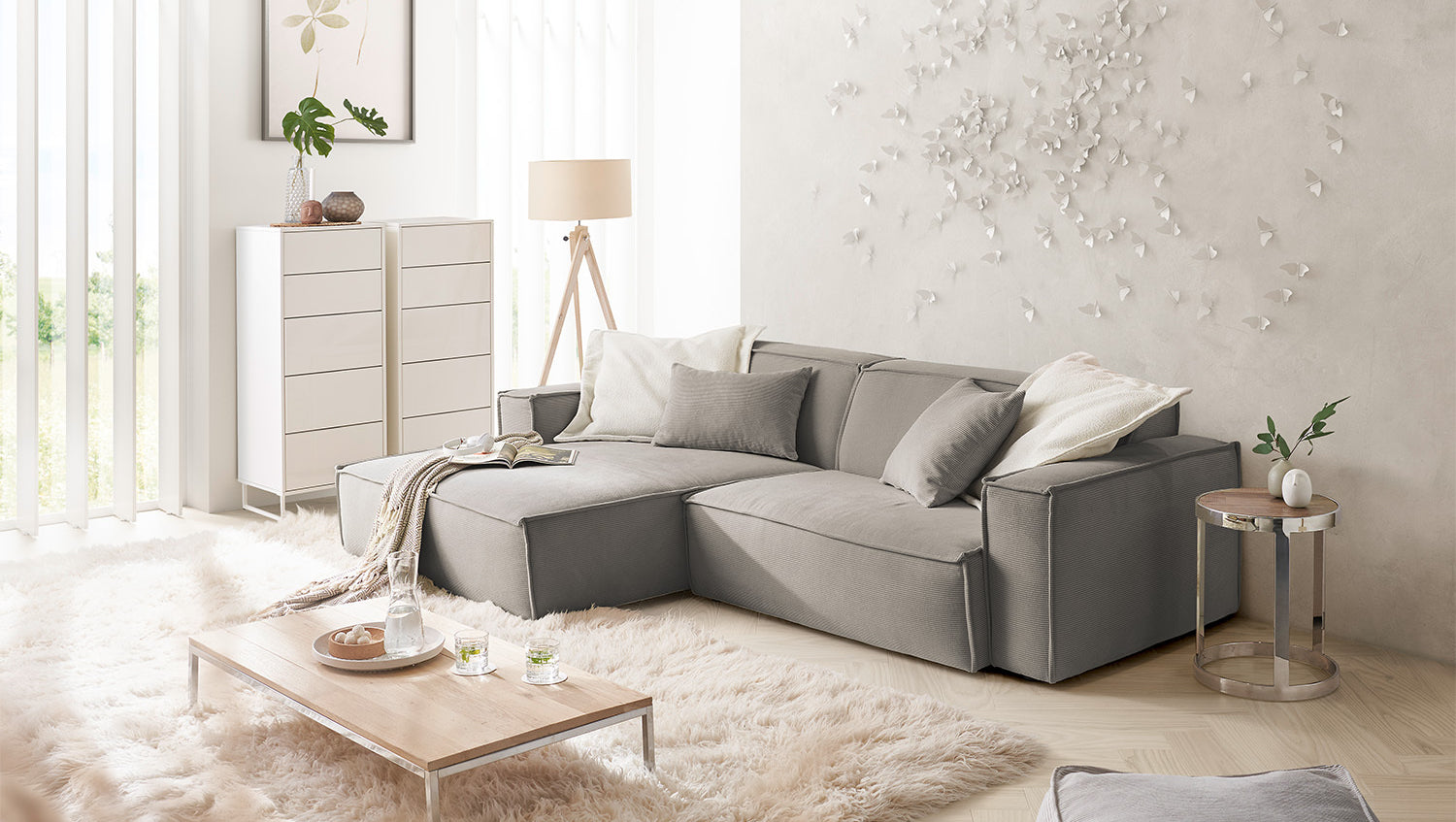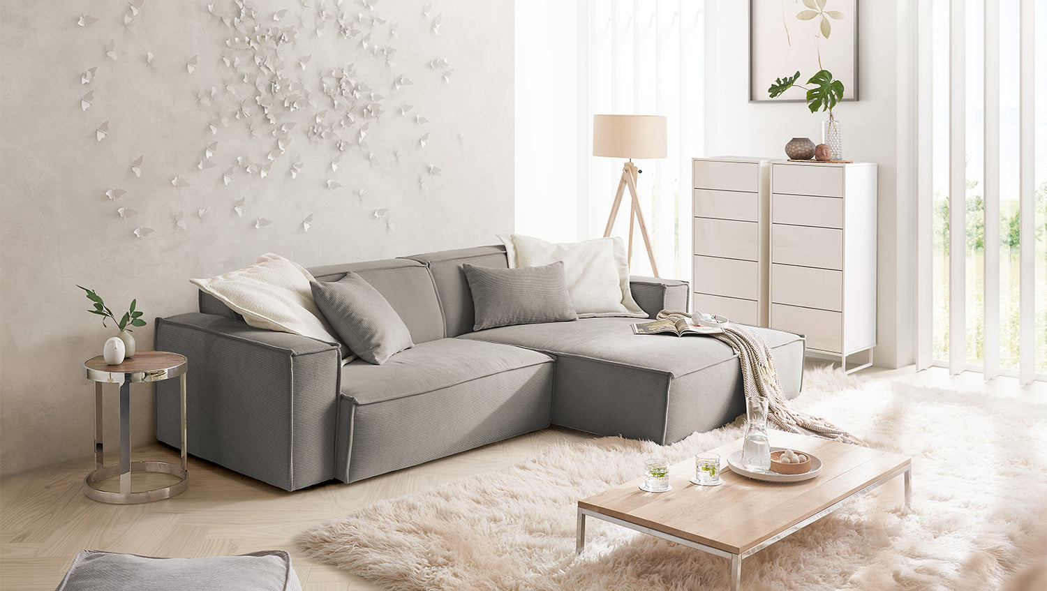 Das KAWOLA Ecksofa SAMU besticht durch seinen hervorragenden Sitzkomfort, der durch den äußerst weichen und legeren Polsteraufbau zustande kommt und zum Verweilen und Entspannen einlädt. Die Polsterung passt sich der Körperform an; Sitzabdrücke sowie Wellenbildung der Bezüge sind warentypisch. Der Bezug aus Feincord ist strapazierfähig, langlebig und sorgt für ein angenehmes Sitzgefühl. Der Stoff verfügt über mehr Rippen und somit eine feinere Struktur als normaler Cord, was ihm eine edlere Optik sowie zeitlose Eleganz verleiht. So fügt sich das Sofa fügt nahtlos in jede Umgebung ein und macht auch frei im Raum stehend eine gute Figur. Wenn Sie Ihrem Wohnzimmer einen außergewöhnlichen Anstrich verleihen wollen, ist das Sofa SAMU definitiv das Richtige für Sie!