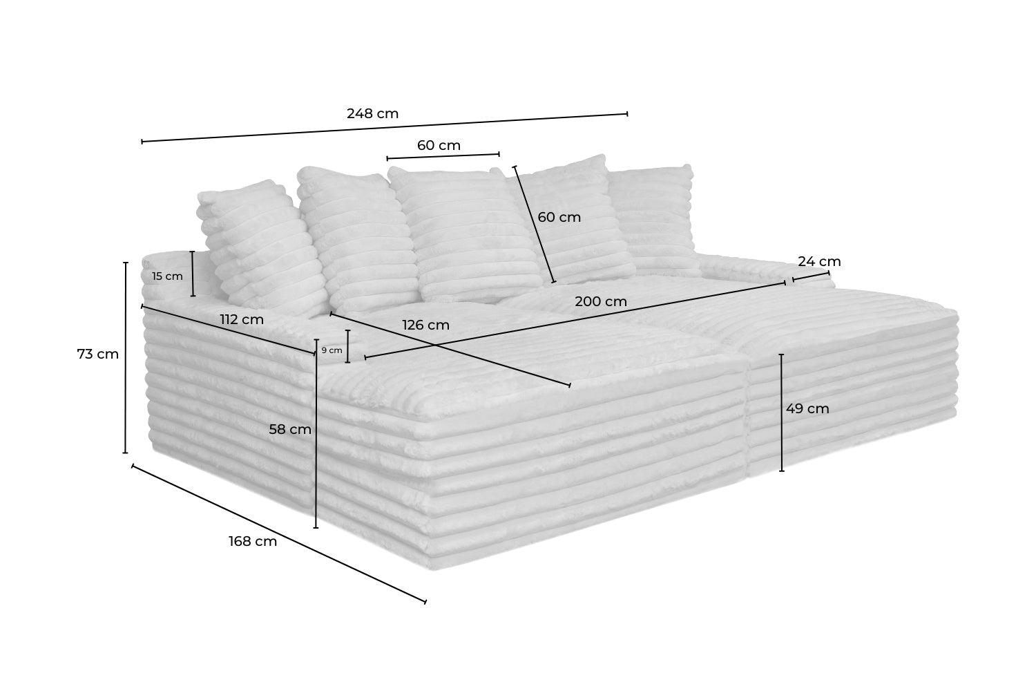 Das Big Sofa CADY von KAWOLA überzeugt mit seinem trendigen Cordbezug, der durch besonders breite Rippen eine einzigartige Haptik und Optik bietet. Cord liegt aktuell voll im Trend und begeistert mit seiner Strapazierfähigkeit und dem weichen Griff. Dank des Rundumbezugs fügt sich das Sofa frei im Raum harmonisch ein. Mit einer großzügigen Breite von 248 cm und einer beeindruckenden Sitztiefe von 168 cm bietet CADY Platz für bis zu 3 Personen - perfekt für entspannte Stunden. Der weiche Sitzkomfort, kombiniert mit 6 großen Rückenkissen, garantiert Gemütlichkeit auf höchstem Niveau. Der Cordstoff zeichnet sich durch geringe Pillingbildung aus, was die Langlebigkeit unterstützt. Die stabilen Kunststoffgleiter sorgen für sicheren Stand und schonen den Boden. Ob für ausgedehnte Serienabende oder gesellige Runden - das Sofa CADY ist ein echtes Highlight für Ihr Wohnzimmer. Bringen Sie Komfort und Stil in Ihr Zuhause!