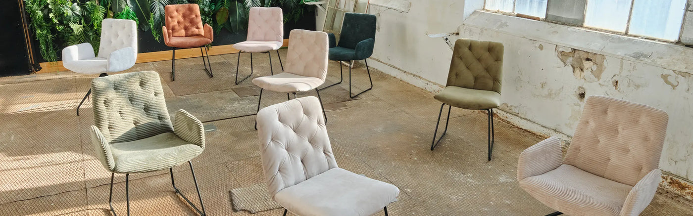 Der NEW CHARME Esszimmersessel ist wahlweise mit edlem Velvet- oder trendigem Cord-Bezug erhältlich. Beide Stoffarten überzeugen durch ihre angenehme Haptik und hochwertige Verarbeitung. Eine Übersicht aller verfügbaren Farben finden Sie in der Farbauswahl oder über unsere Farbmuster-Vorschau.