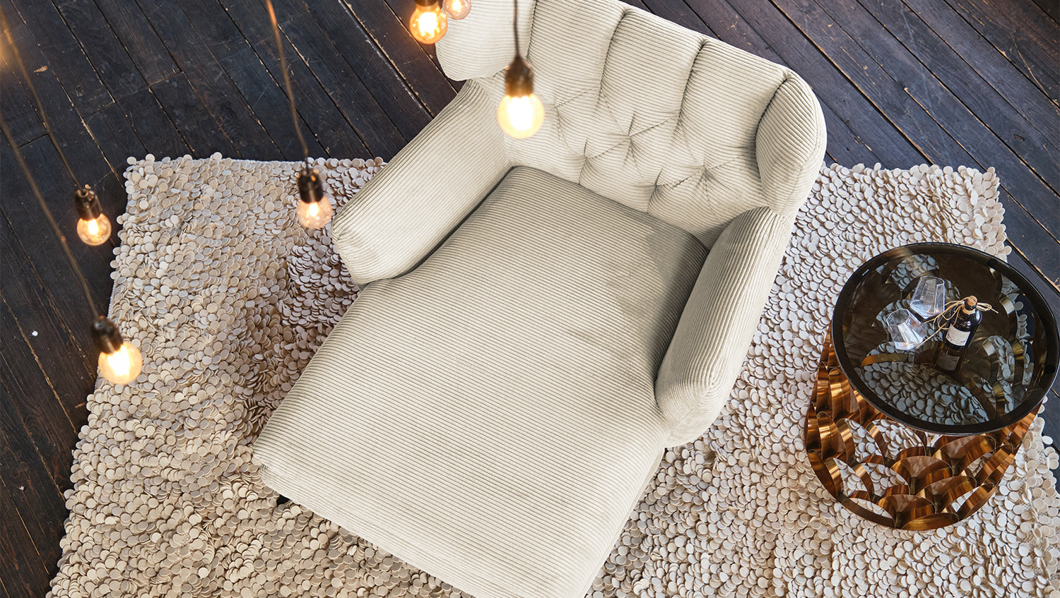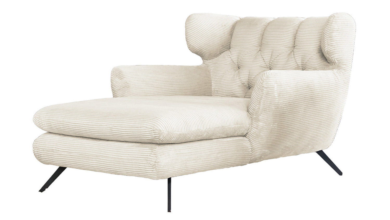 Zu der ausgefallenen Form des Chaiselongue CHARME wurde der Bezug in Cord gewählt.