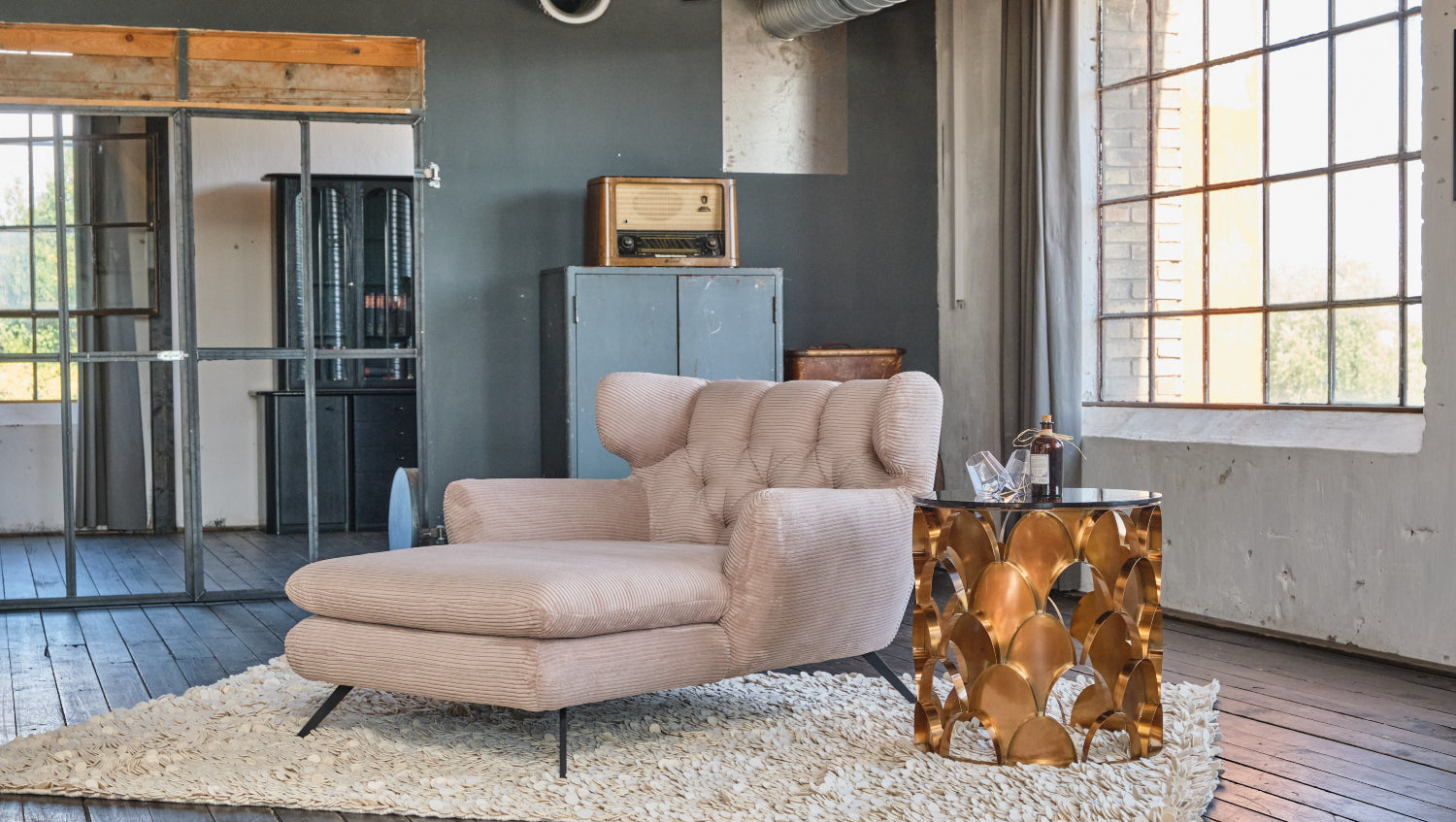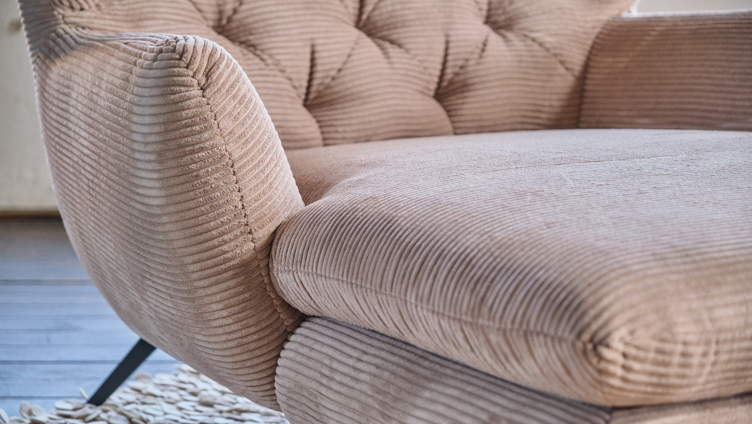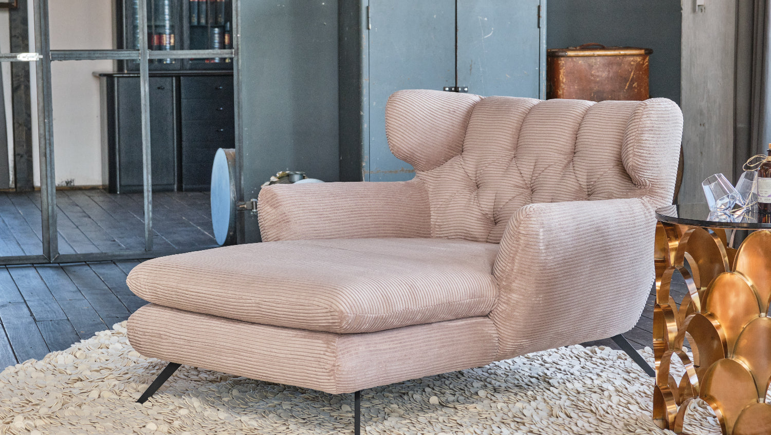 Zu der ausgefallenen Form des Chaiselongue CHARME wurde der Bezug in Cord gewählt.
