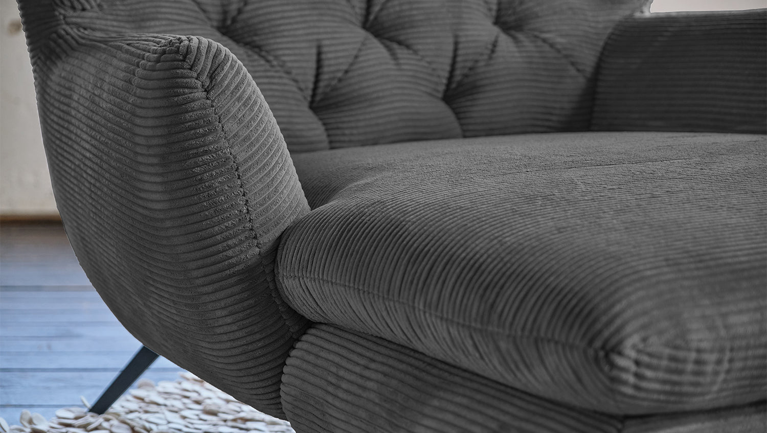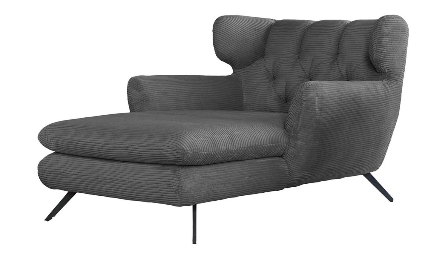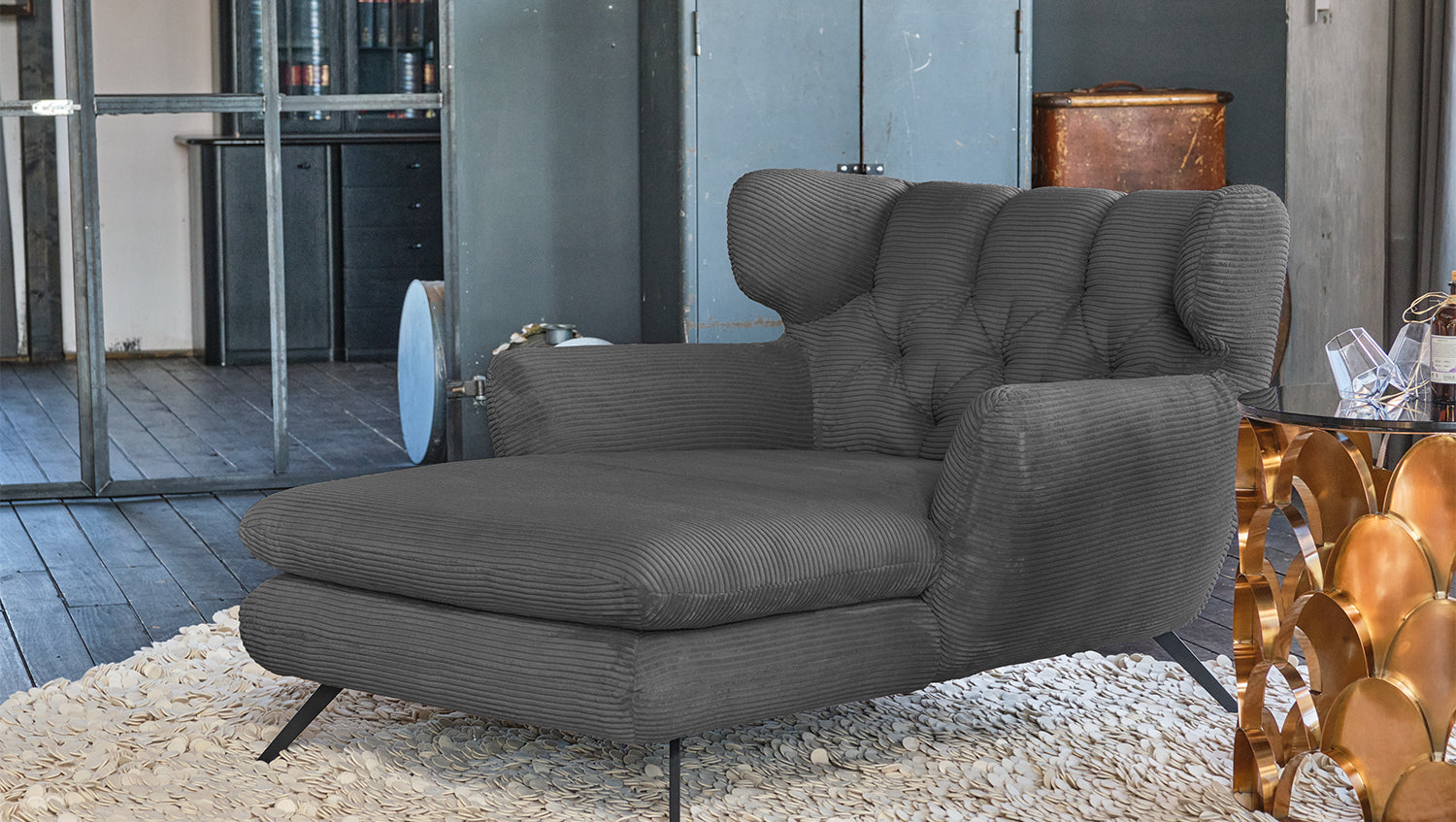 Zu der ausgefallenen Form des Chaiselongue CHARME wurde der Bezug in Cord gewählt.