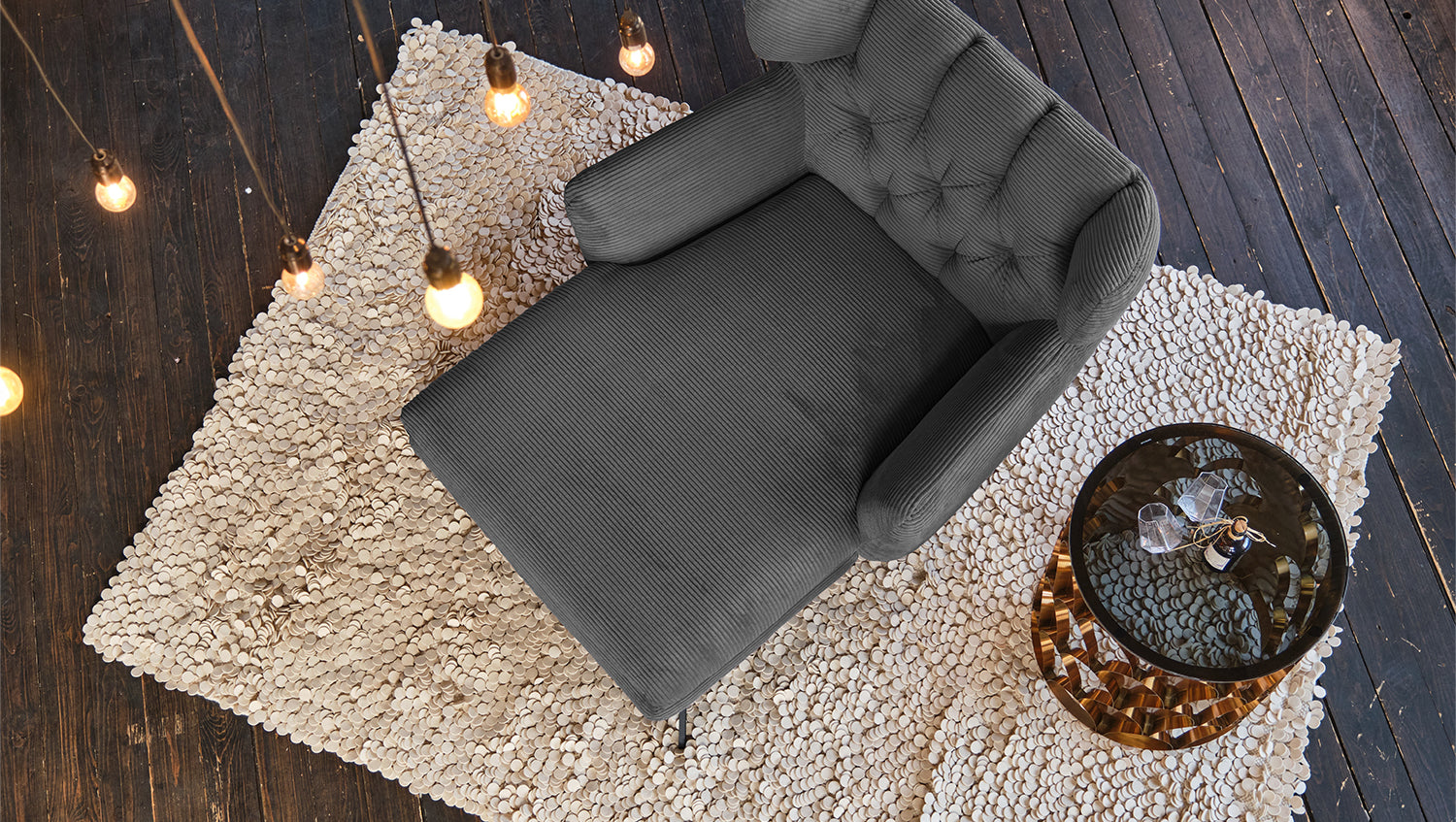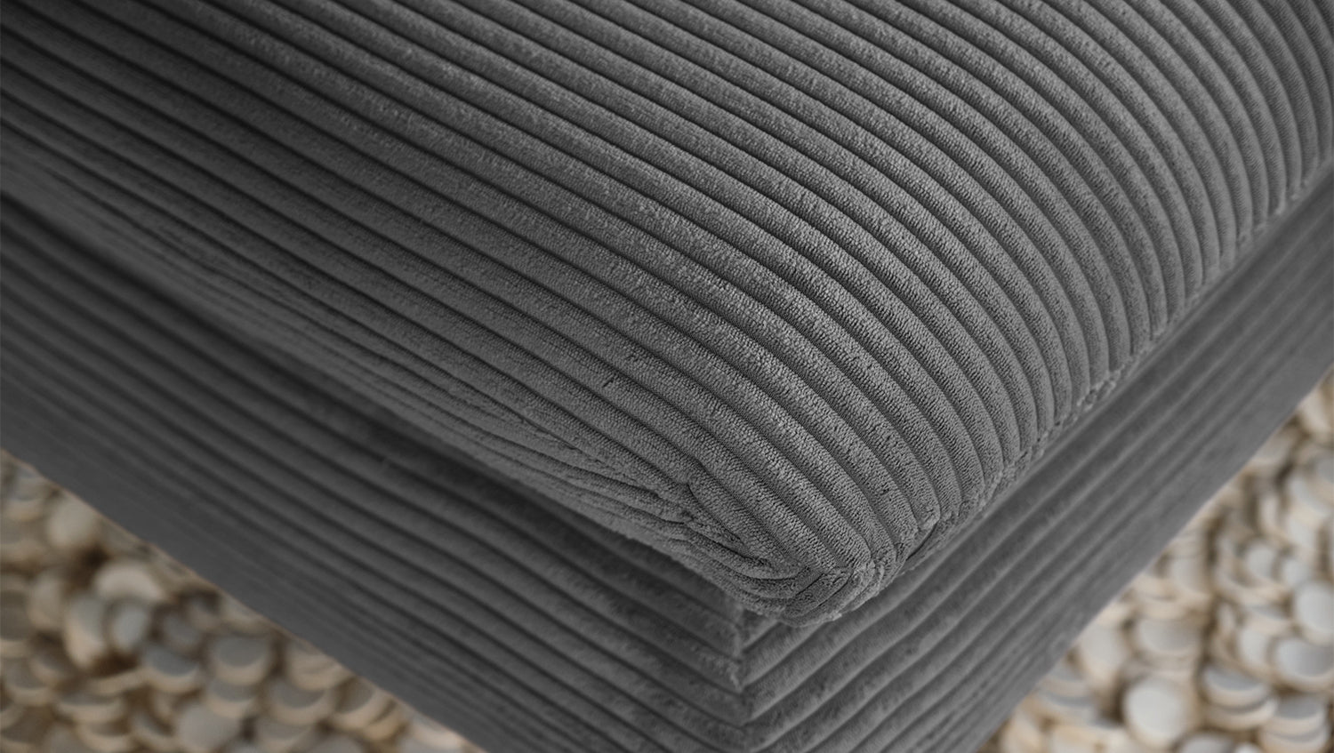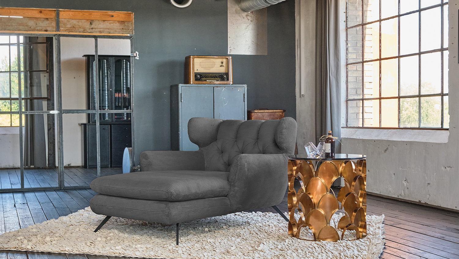 Zu der ausgefallenen Form des Chaiselongue CHARME wurde der Bezug in Cord gewählt.