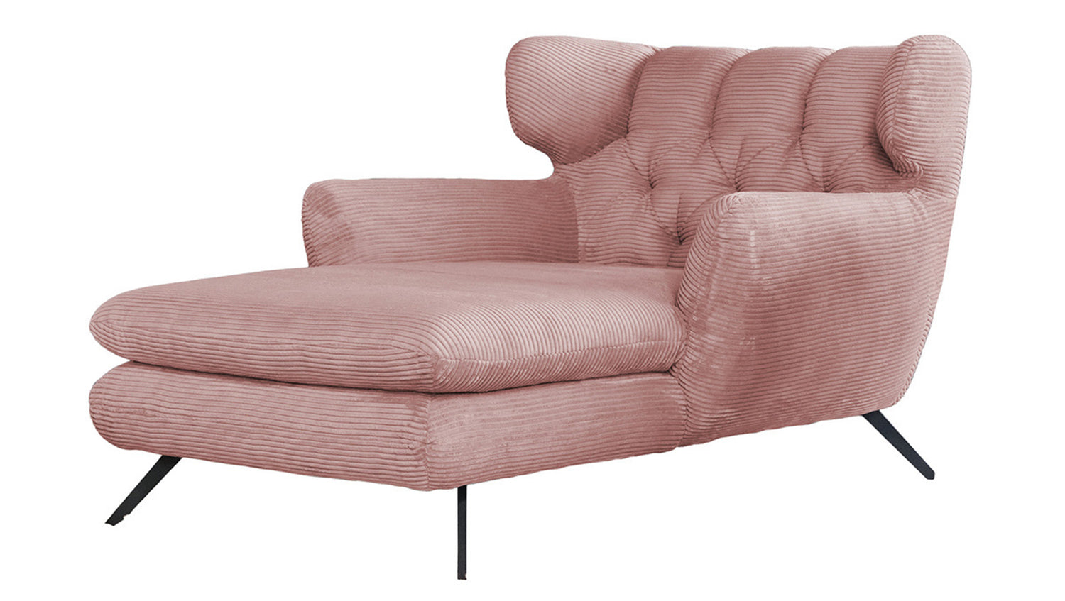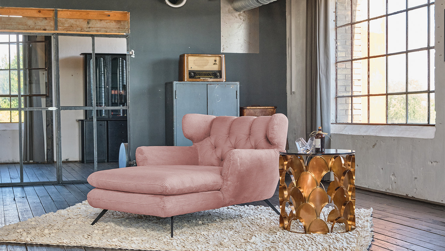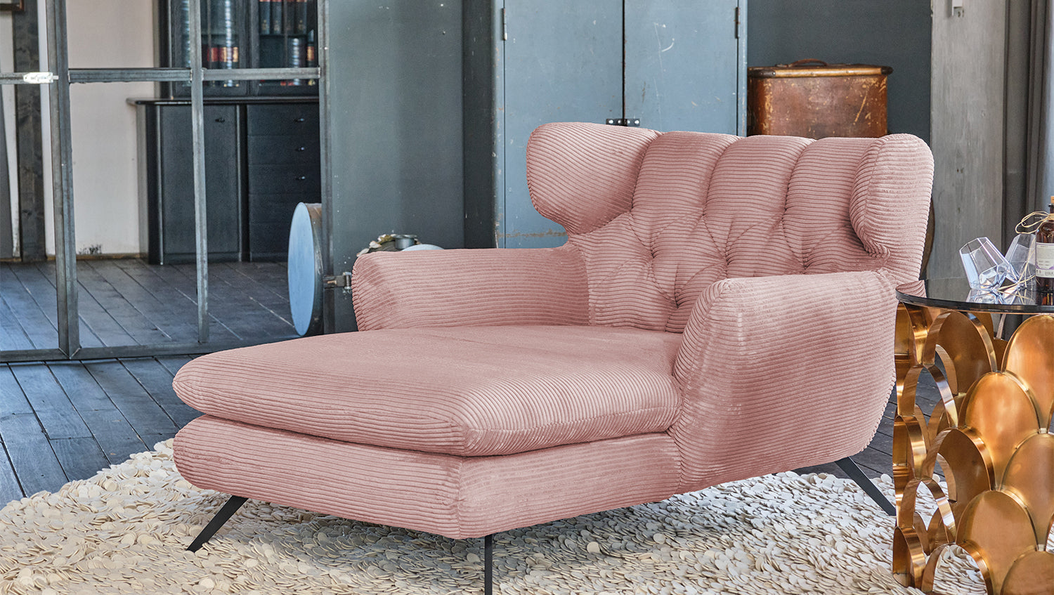 Zu der ausgefallenen Form des Chaiselongue CHARME wurde der Bezug in Cord gewählt.
