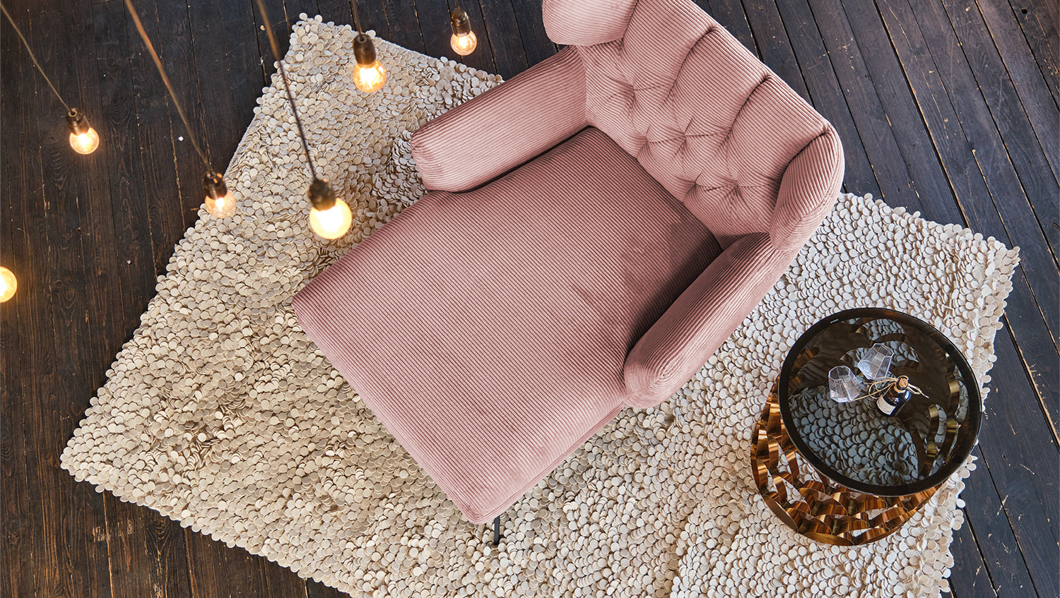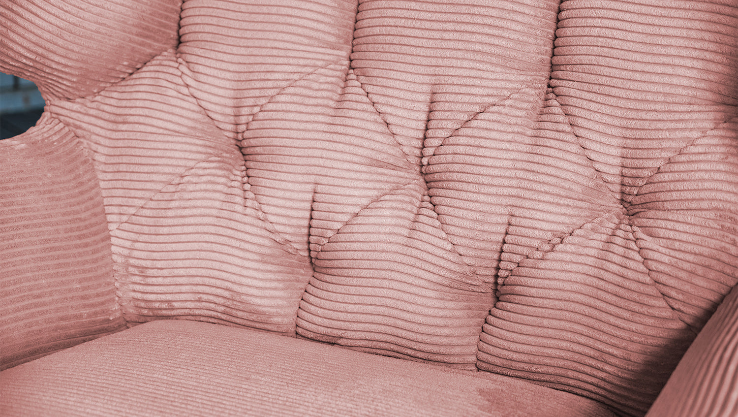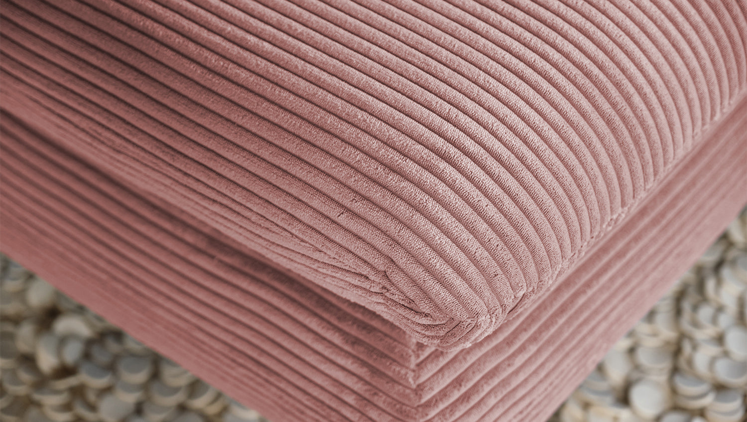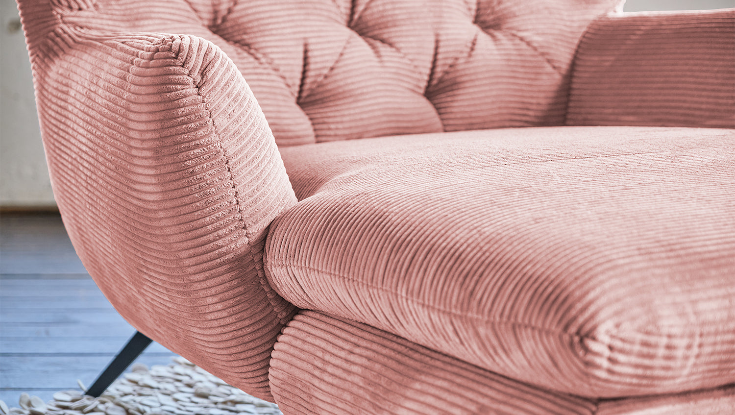 Zu der ausgefallenen Form des Chaiselongue CHARME wurde der Bezug in Cord gewählt.