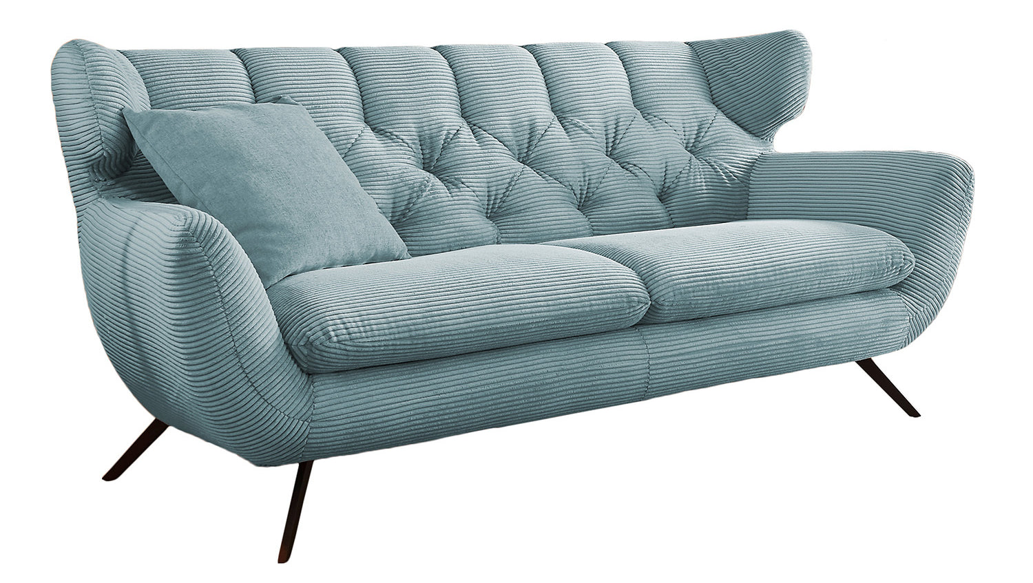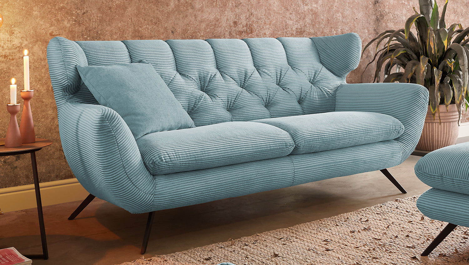 Die KAWOLA Sitzgruppe CHARME, bestehend aus einem Sofa, einem Sessel und einem Hocker, wurde komplett mit Cord überzogen. Auch der Rücken wurde mit Cord überzogen, so dass das Sofa und der Sessel bei Bedarf auch frei in den Raum gestellt werden können. Der Stil erinnert an die sechziger Jahre: Die Rücken des Sofas und des Sessels wurden aufwendig abgesteppt ohne Knöpfe; die Rückenlehnen wurden an den beiden Seiten leicht nach vorne gewölbt und erinnern an die Form eines Ohrensessels; die Füße aus schwarzem Metall sind leicht ausgestellt. Die Polsterung der KAWOLA Kollektion CHARME besteht aus PUR-Schaum und besticht durch ihren weichen und legeren Sitzkomfort. Die Sitzkissen passen sich der Körperform angenehm an. Wer nicht nur eine Sitzgelegenheit sucht, sondern ein ganz besonderes Highlight, der liegt mit der Sitzgruppe CHARME goldrichtig!