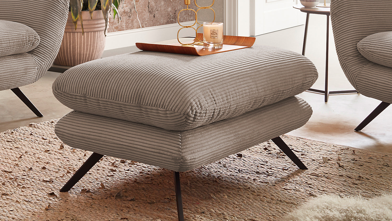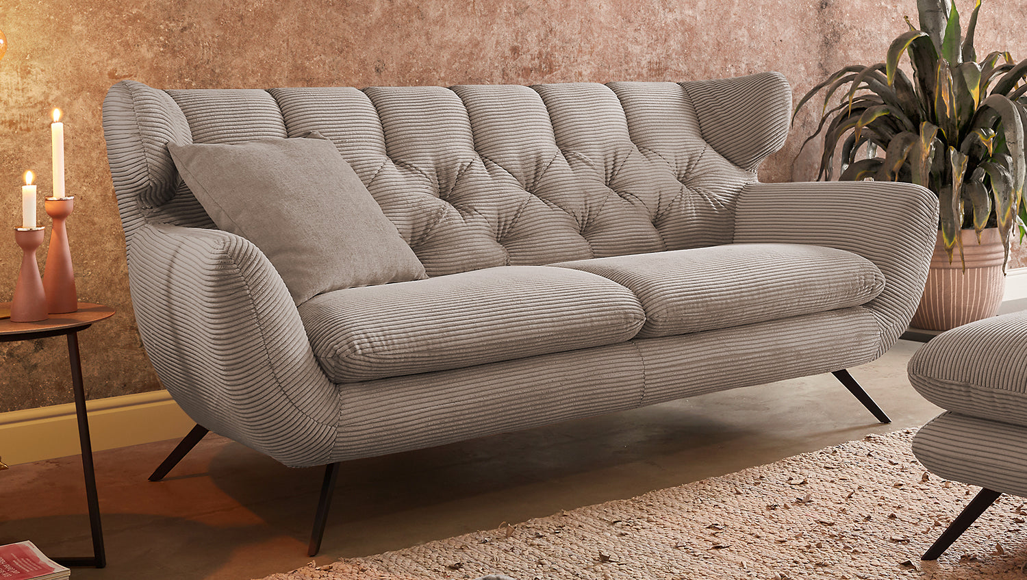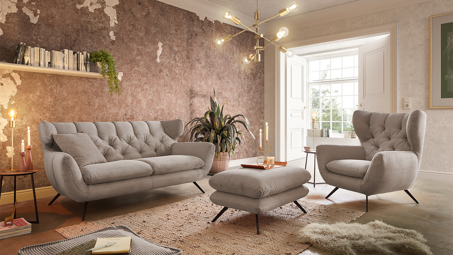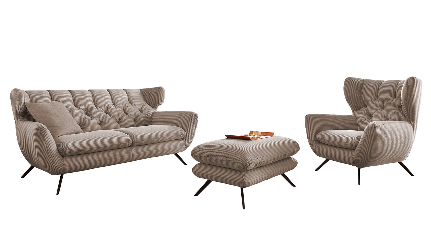 Die KAWOLA Sitzgruppe CHARME, bestehend aus einem Sofa, einem Sessel und einem Hocker, wurde komplett mit Cord überzogen. Auch der Rücken wurde mit Cord überzogen, so dass das Sofa und der Sessel bei Bedarf auch frei in den Raum gestellt werden können. Der Stil erinnert an die sechziger Jahre: Die Rücken des Sofas und des Sessels wurden aufwendig abgesteppt ohne Knöpfe; die Rückenlehnen wurden an den beiden Seiten leicht nach vorne gewölbt und erinnern an die Form eines Ohrensessels; die Füße aus schwarzem Metall sind leicht ausgestellt. Die Polsterung der KAWOLA Kollektion CHARME besteht aus PUR-Schaum und besticht durch ihren weichen und legeren Sitzkomfort. Die Sitzkissen passen sich der Körperform angenehm an. Wer nicht nur eine Sitzgelegenheit sucht, sondern ein ganz besonderes Highlight, der liegt mit der Sitzgruppe CHARME goldrichtig!
