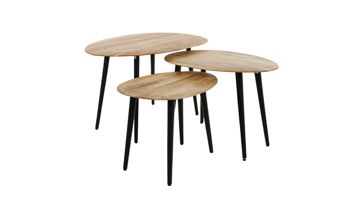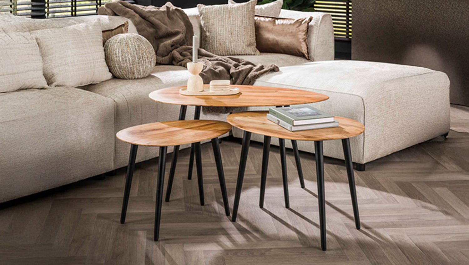 Das trendige organische Couchtisch-Set PALINA von KAWOLA ist aus massivem Akazienholz mit natürlicher Oberfläche gefertigt. Die Kanten der Platten sind leicht abgeschrägt, was einen schönen Effekt ergibt. Die Tische lassen sich nach Belieben spielerisch zusammenstellen. Das Set besteht aus drei Tischen. Der größte Tisch hat eine Fläche von 90 x 55 cm und eine Höhe von 50 cm. Der mittlere Tisch hat eine Fläche von 66 x 46 cm und eine Höhe von 46 cm. Der kleinste Tisch hat eine Fläche von 55 x 41 cm und eine Höhe von 42 cm. Ob im modernen Loft, im gemütlichen Wohnzimmer oder in einer eleganten Lounge – das Couchtisch-Set PALINA setzt stilvolle Akzente und verbindet Funktionalität mit zeitloser Ästhetik.