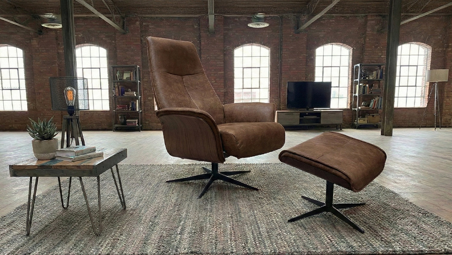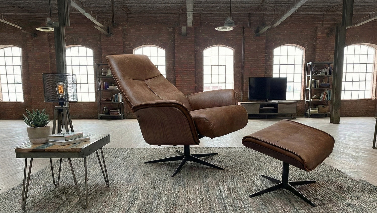 KAWOLA Relaxsessel FERREIRA Drehsessel Lederfaserstoff cognac mit Hocker