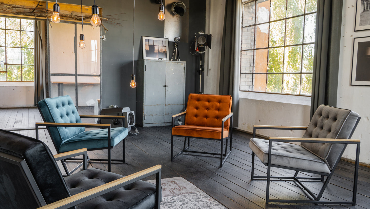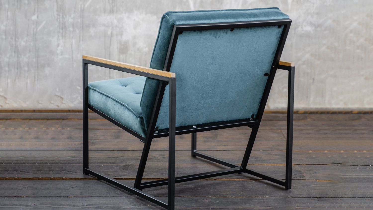 Trotz der geradlinigen Silhouette des Stuhls strahlt er durch das Sitz- und Rückenpolster welche mit mit anschmiegsamem, samtartigem Stoff bezogen wurden Komofort und Gemütlichkeit aus.