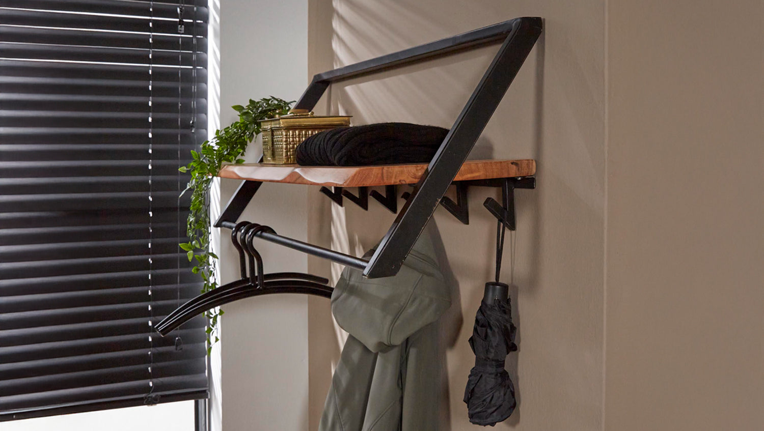 Die Wandgarderobe ALEGRA von KAWOLA überzeugt mit hochwertigem Design und durchdachter Funktionalität. Die Hutablage aus massivem Akazienholz besticht durch ihre natürliche Maserung und das edle schwarze Finish, das ihr einen einzigartigen Look verleiht. Unter der Ablage befinden sich 6 stabile Haken sowie eine Metallstange zum Aufhängen von Kleiderbügeln – beide aus pulverbeschichtetem Metall für langlebige Qualität. Mit zwei Befestigungsösen lässt sich die 100 cm breite, 38 cm hohe und 32 cm tiefe Garderobe sicher montieren. Ideal geeignet für Flur, Diele oder Eingangsbereich, bietet ALEGRA eine stilvolle Lösung für mehr Ordnung!