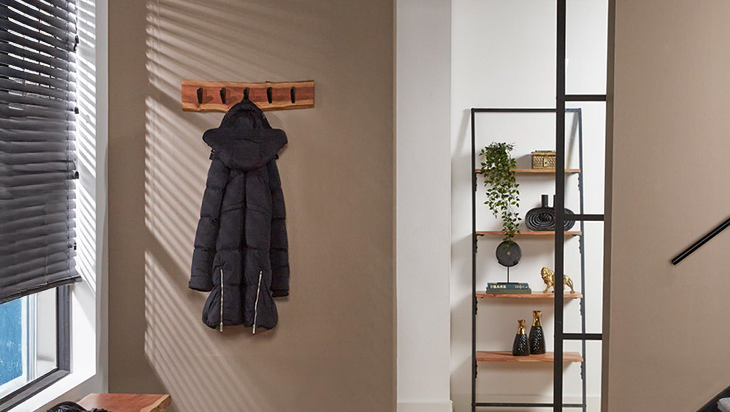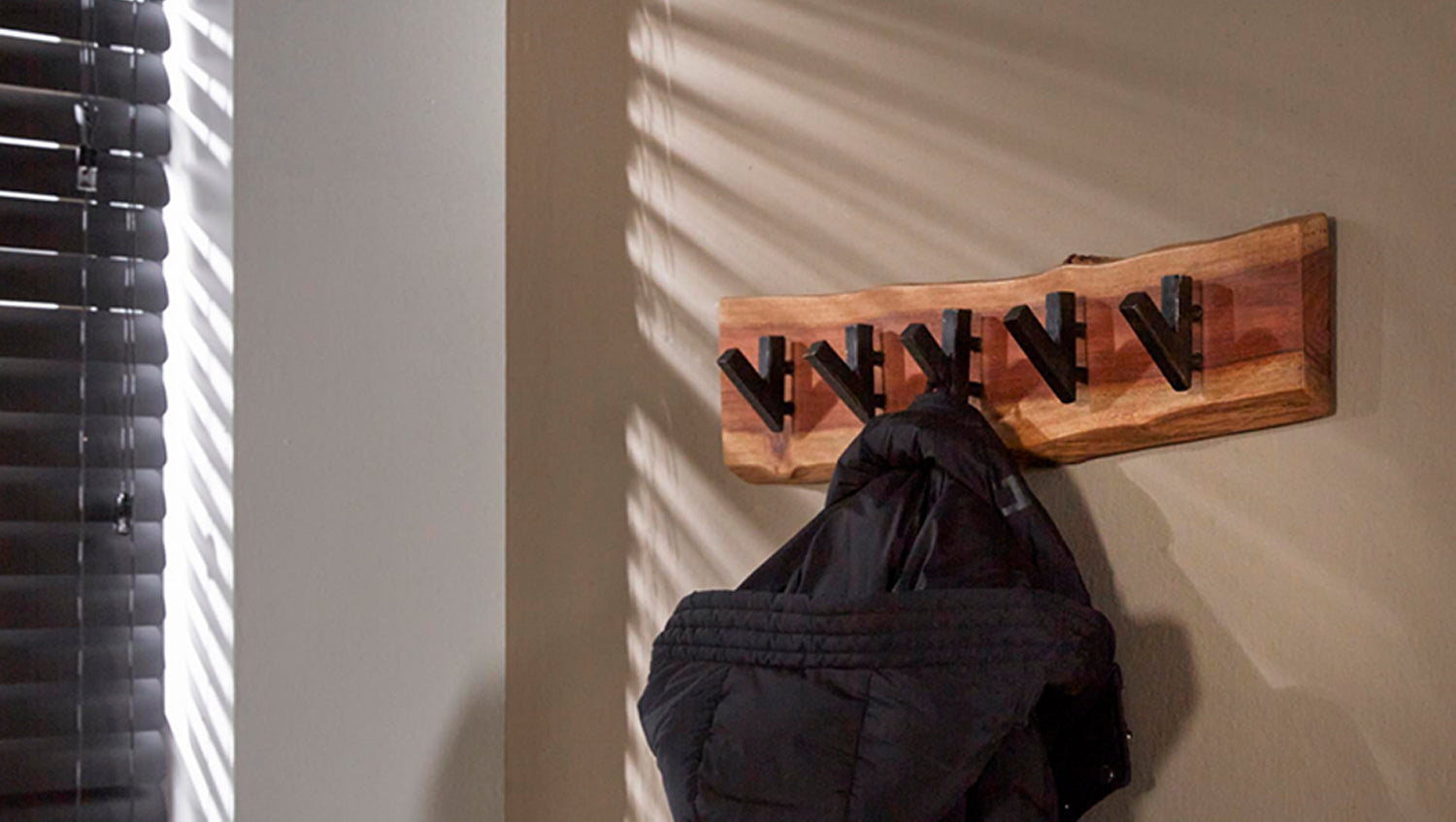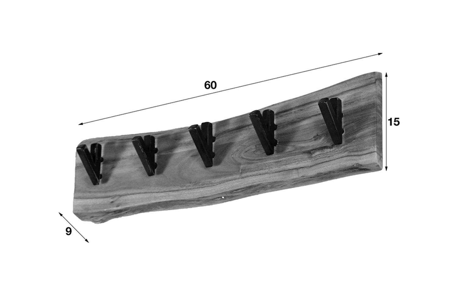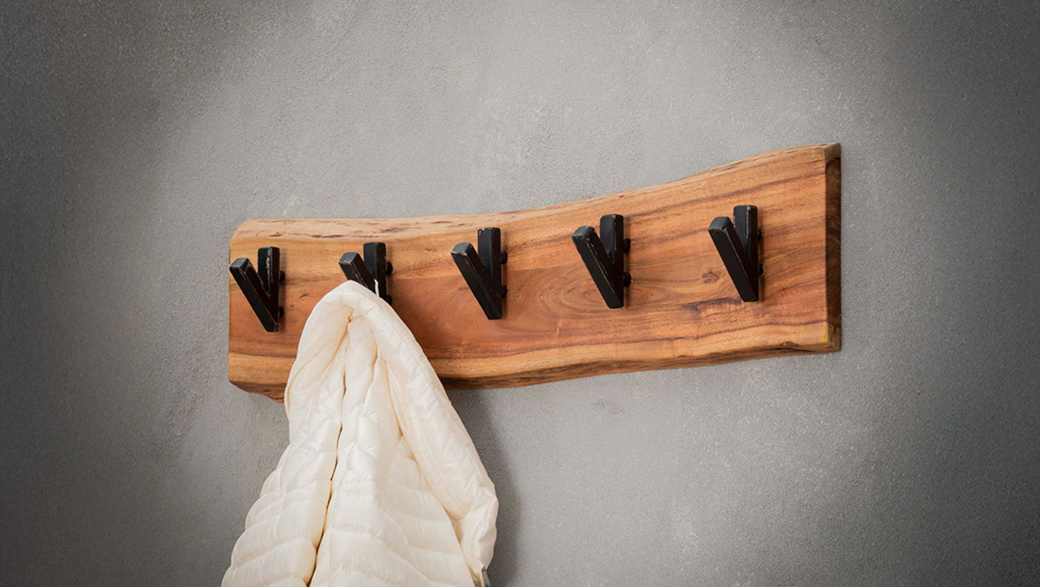 Die Wandgarderobe NEREA von KAWOLA überzeugt mit ihrem einzigartigen, natürlichen Design. Gefertigt aus massivem Akazienholz, besticht sie durch ihre feine Maserung und markanten Äste, die ihr einen besonderen Charme verleihen. Das Holz wird nach traditionellen Methoden verarbeitet, was der Garderobe einen natürlichen und einzigartigen Look verleiht. Fünf robuste Haken aus schwarz geschliffenem Metall bieten Platz für Jacken, Taschen und Accessoires. Dank der zwei Befestigungsösen auf der Rückseite lässt sich die 60 cm breite, 15 cm hohe und 9 cm tiefe Garderobe mühelos an der Wand montieren. Stilvoll, kompakt und funktional - NEREA ist die perfekte Wahl für Flur, Diele oder Schlafzimmer!