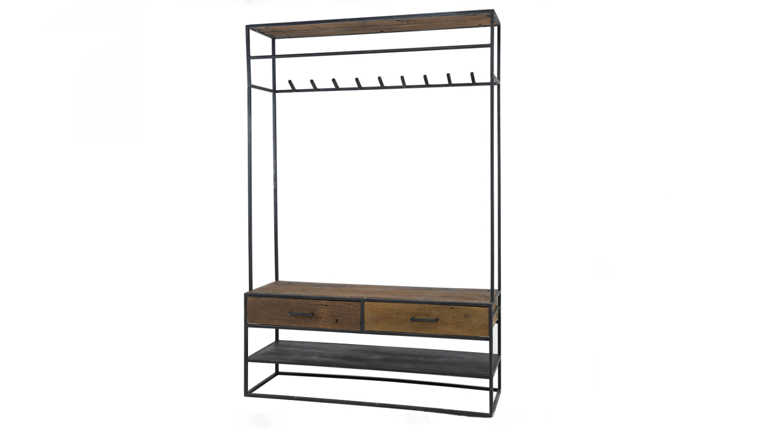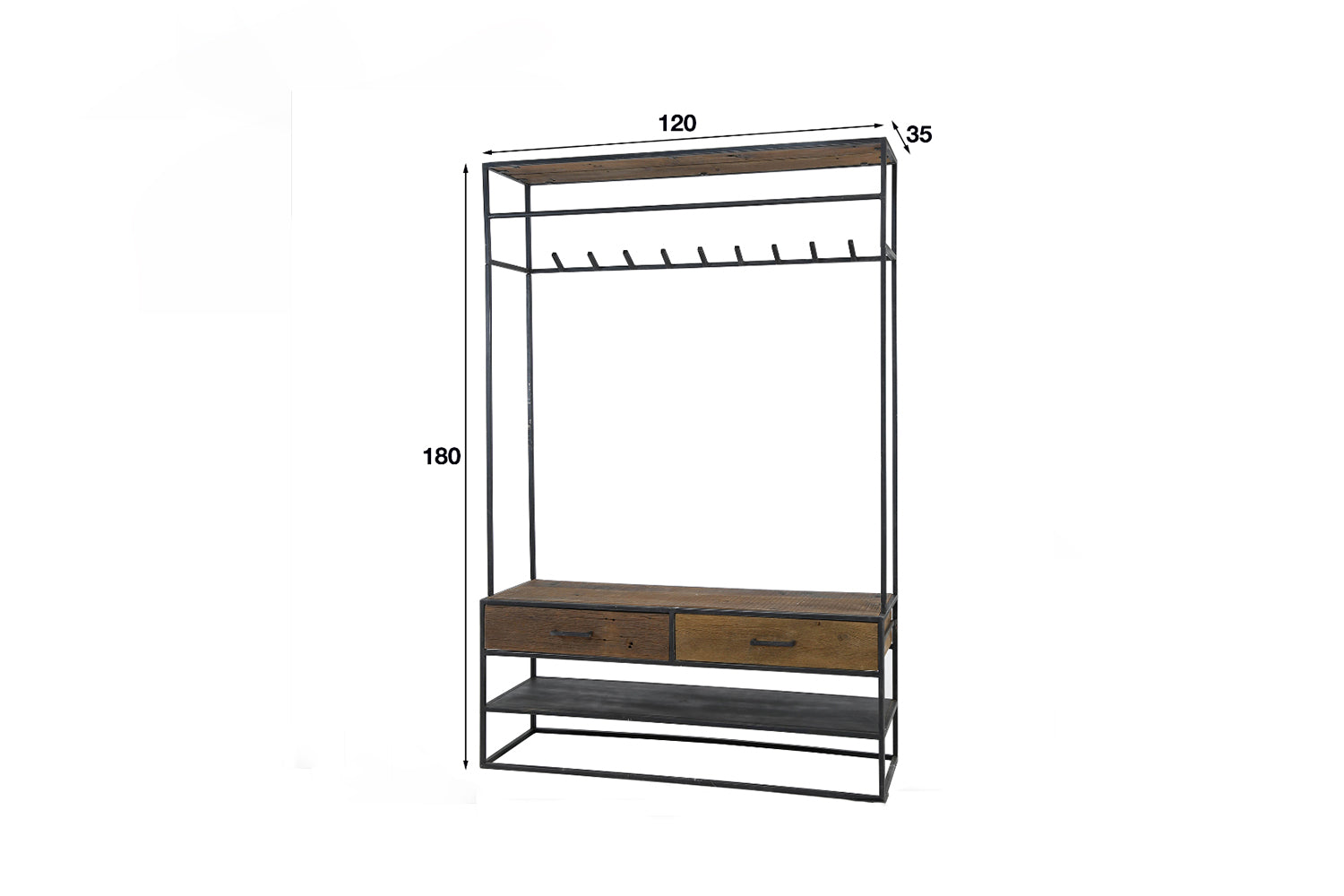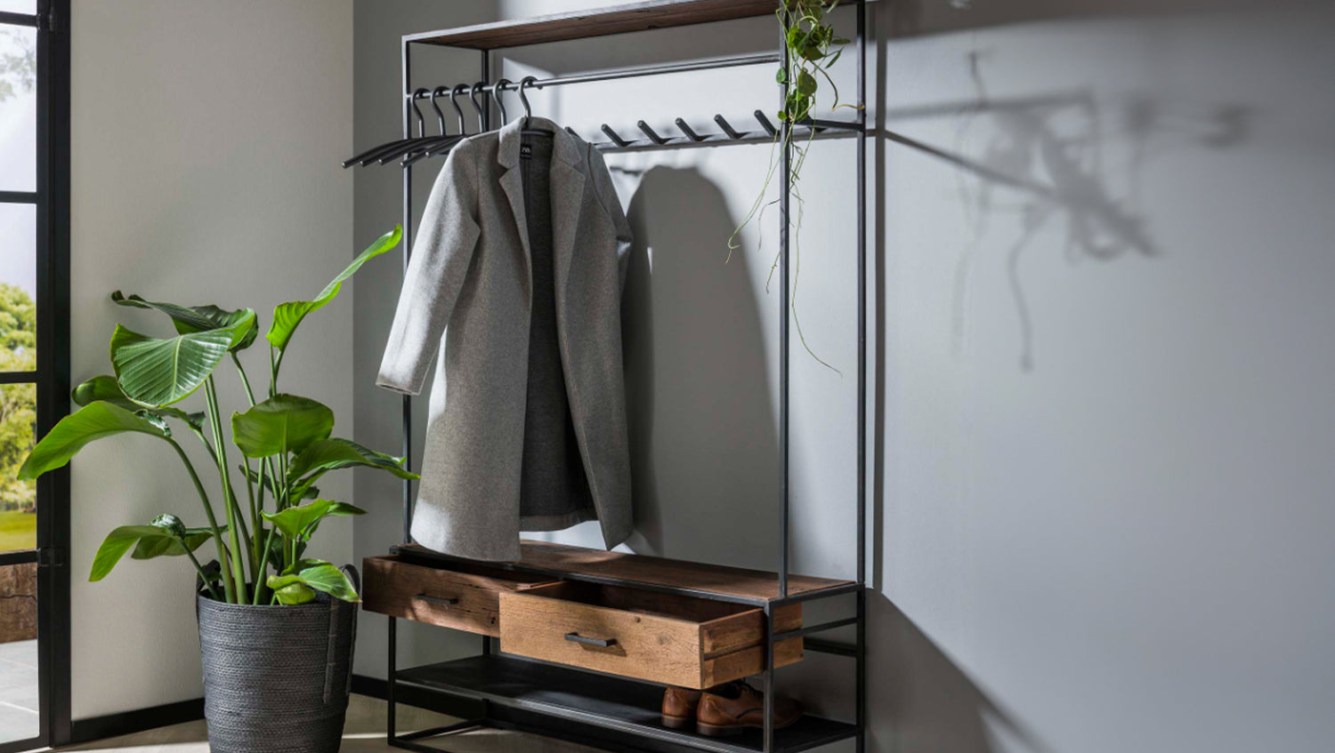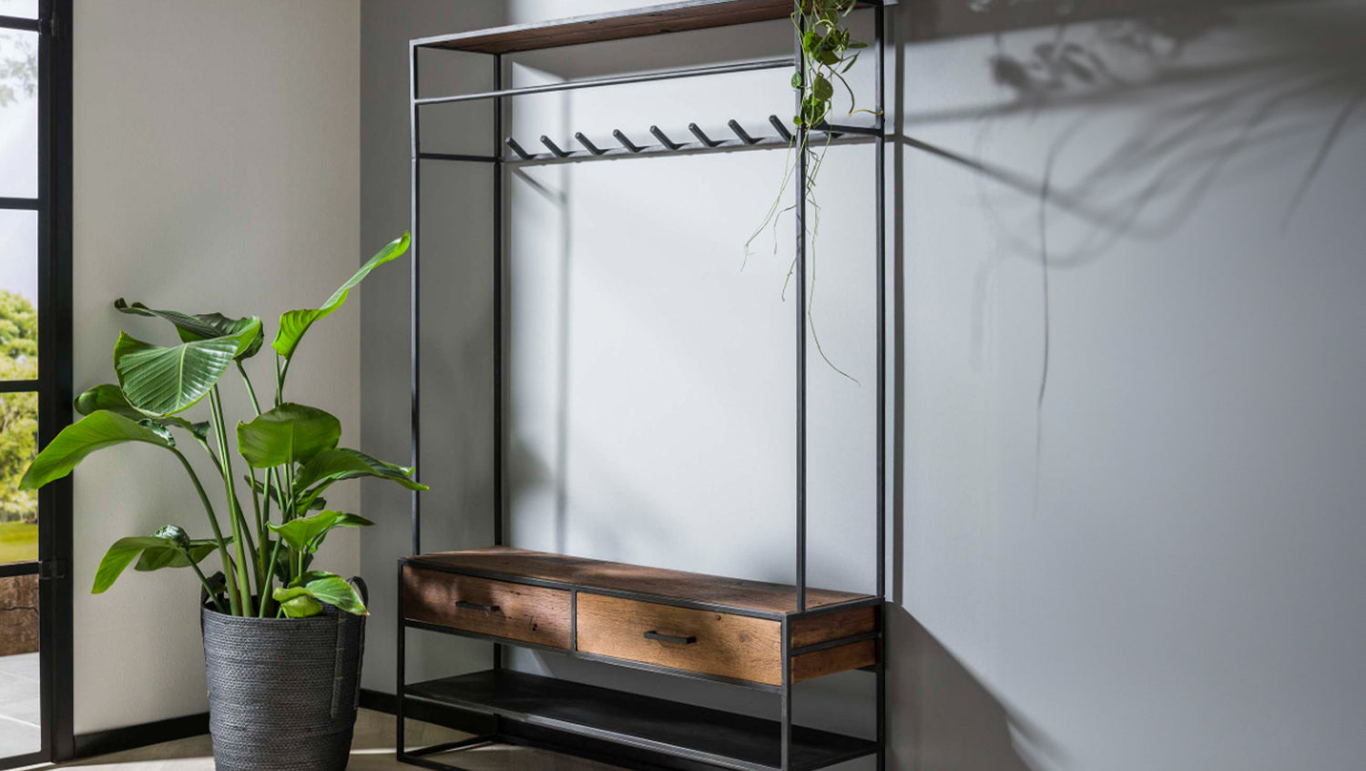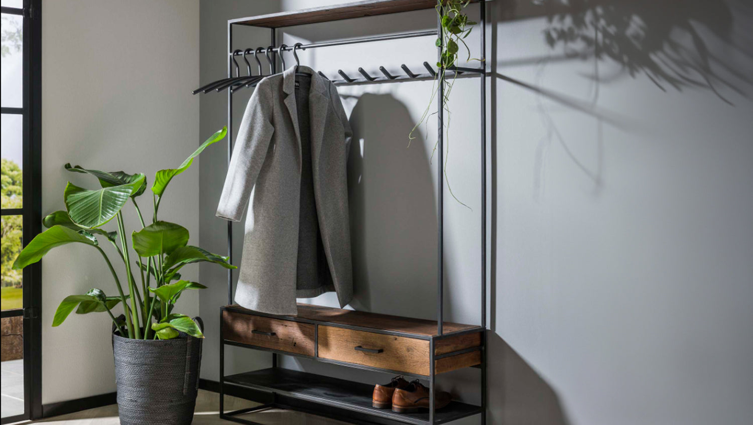 Die KAWOLA Garderobe TENBY vereint robustes Metall mit warmen Holzelementen und bietet eine ideale Lösung für einen aufgeräumten Eingangsbereich. Mit einer Höhe von 180 cm, Breite von 120 cm und Tiefe von 35 cm schafft sie ausreichend Platz für Mäntel, Jacken, Schuhe und Accessoires. Das offene Fach ermöglicht eine schnelle Ablage von Taschen oder Hüten, während die zwei geräumigen Holzschubladen mit Metallgriffen zusätzlichen Stauraum für Handschuhe, Schals oder Kleinigkeiten bieten. Dank der stabilen Konstruktion und des zeitlosen Industrial-Designs fügt sich TENBY nahtlos in moderne Wohnkonzepte ein. Ob im Flur, der Diele oder dem Ankleidezimmer – diese Garderobe kombiniert Funktionalität mit stilvollem Design und sorgt für eine ordentliche und elegante Atmosphäre