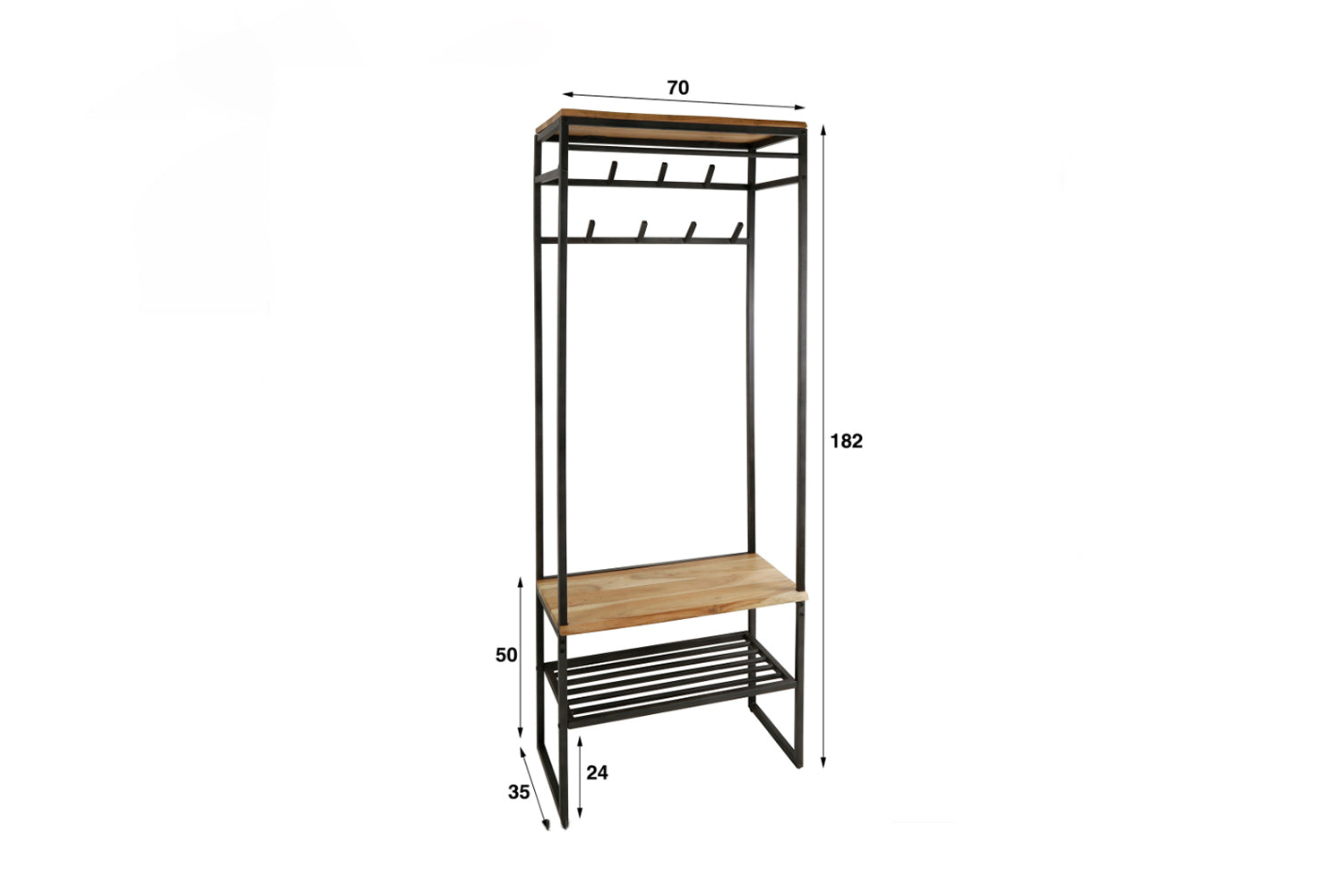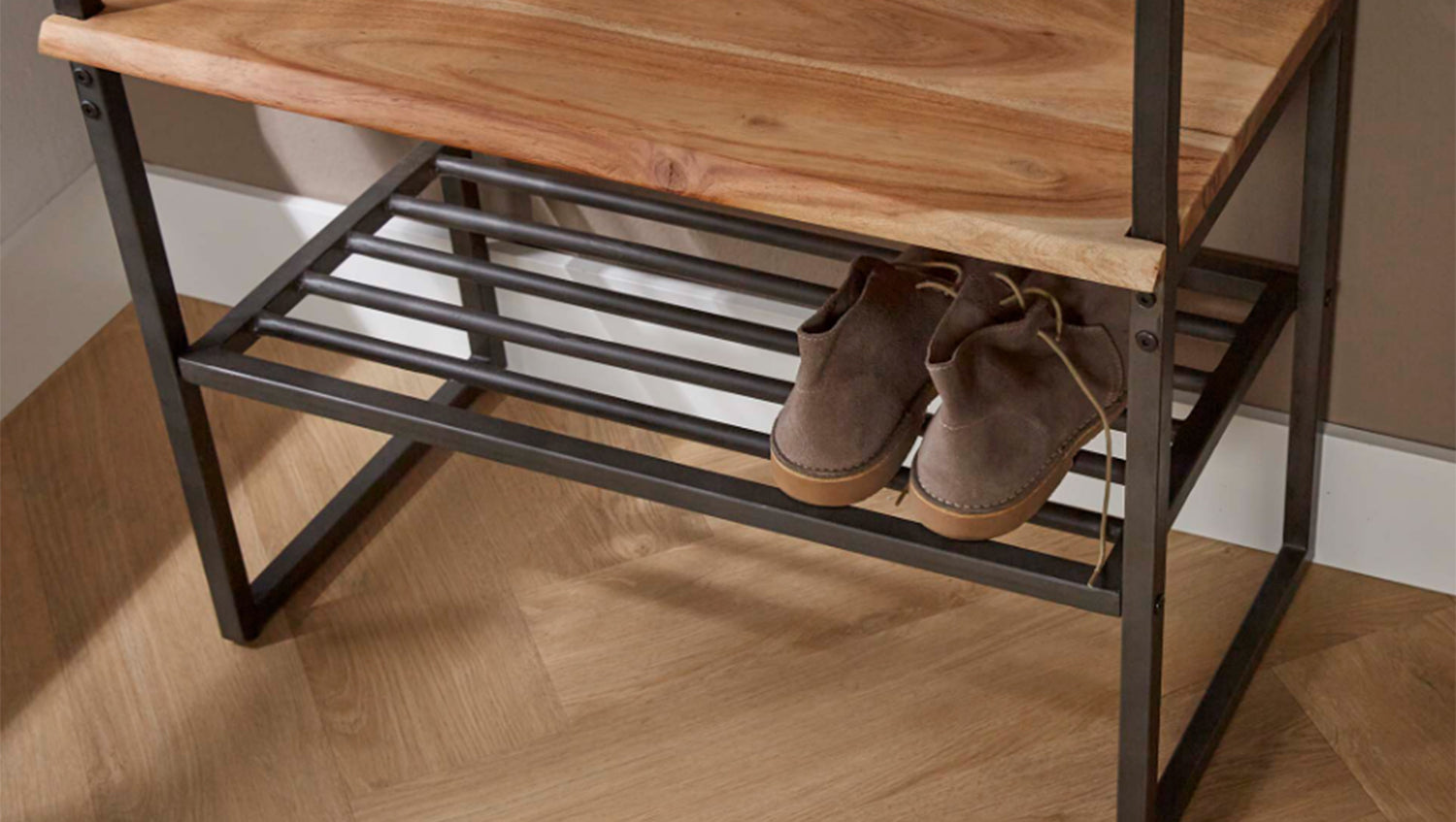 Die KAWOLA Garderobe FLINT kombiniert hochwertiges Akazienholz mit lebendiger Kante und robustes Metall, wodurch ein moderner Industrial-Look entsteht. Mit einer Höhe von 182 cm, Breite von 70 cm und Tiefe von 35 cm bietet sie vielseitigen Stauraum. Acht Haken und eine Metallstange ermöglichen das geordnete Aufhängen von Mänteln und Jacken, während das obere Regal Platz für Accessoires bietet. Das integrierte Schuhregal sorgt für eine praktische Ablage und ermöglicht bequemes Anziehen der Schuhe. FLINT ist die ideale Lösung für einen stilvollen und funktionalen Eingangsbereich!