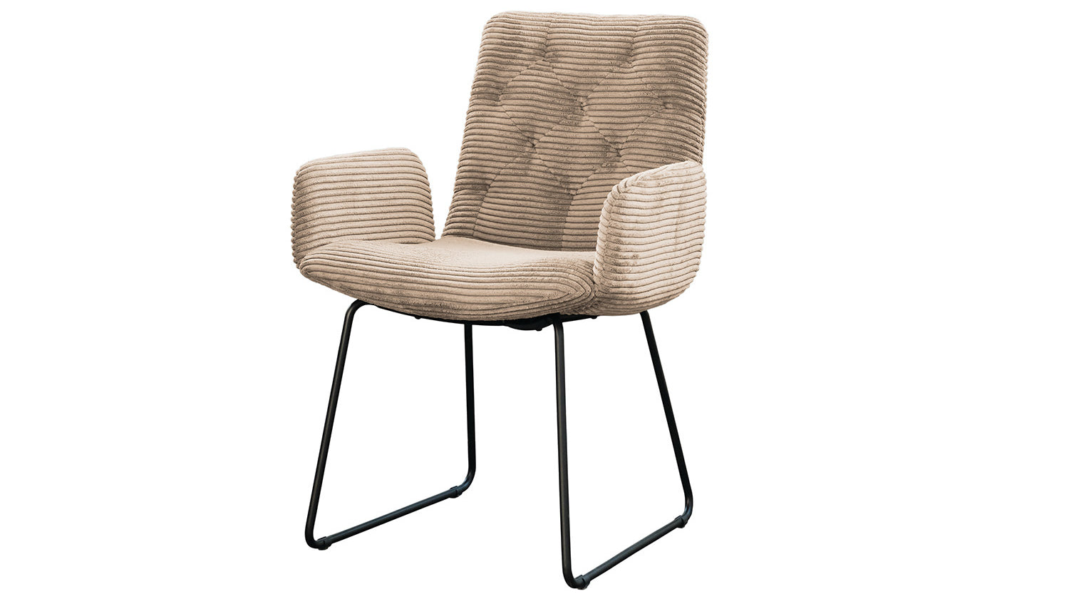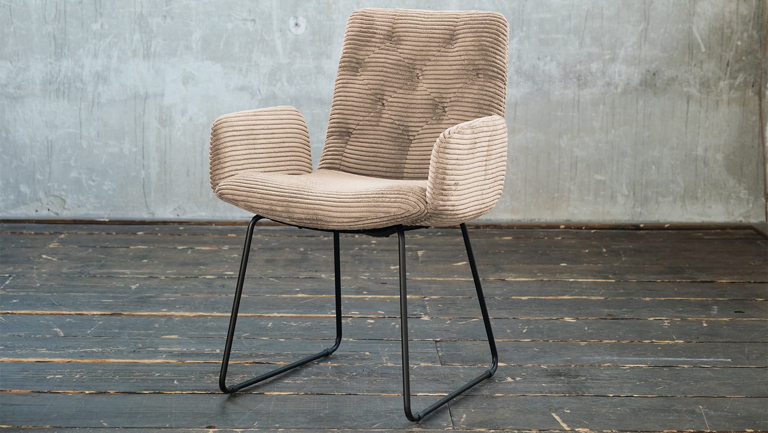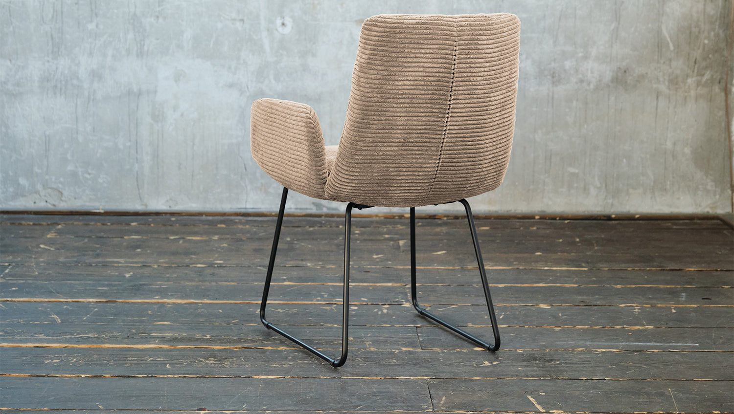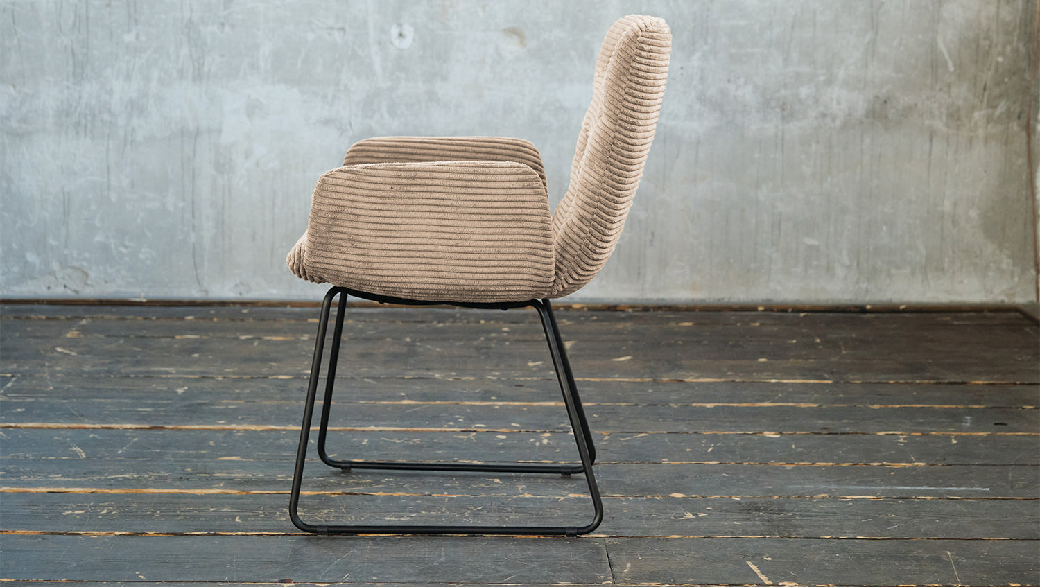 Der KAWOLA Esszimmerstuhl NEW CHARME ist nicht nur um ein Möbelstück, sondern ein wahres Design-Highlight, das in Ihrem Zuhause neue Akzente setzt. Der Stil der Serie NEW CHARME erinnert an die Sechziger Jahre: Der Rücken wurde aufwendig abgesteppt ohne Knöpfe; die Rückenlehne wurde an den beiden Seiten leicht nach vorne gewölbt und erinnert an die Form eines Ohrensessels; die Kufenfüße aus Metall sind pulverbeschichtet. Zu der ausgefallenen Form des Stuhls NEW CHARME wurde hier der Bezug in angesagtem Cord-Stoff gewählt. Wer nicht nur einen Esszimmerstuhl sucht, sondern einen zeitlos-stylischen Trendsetter, liegt mit der Serie NEW CHARME von KAWOLA goldrichtig!