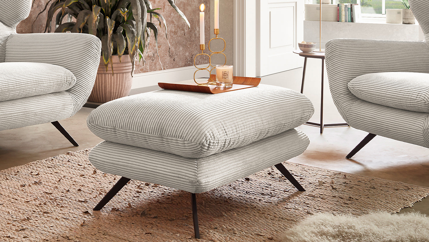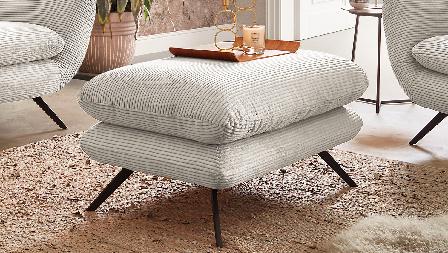 • Elegante Hockerbank mit Bezug aus angesagtem Cord-Stoff