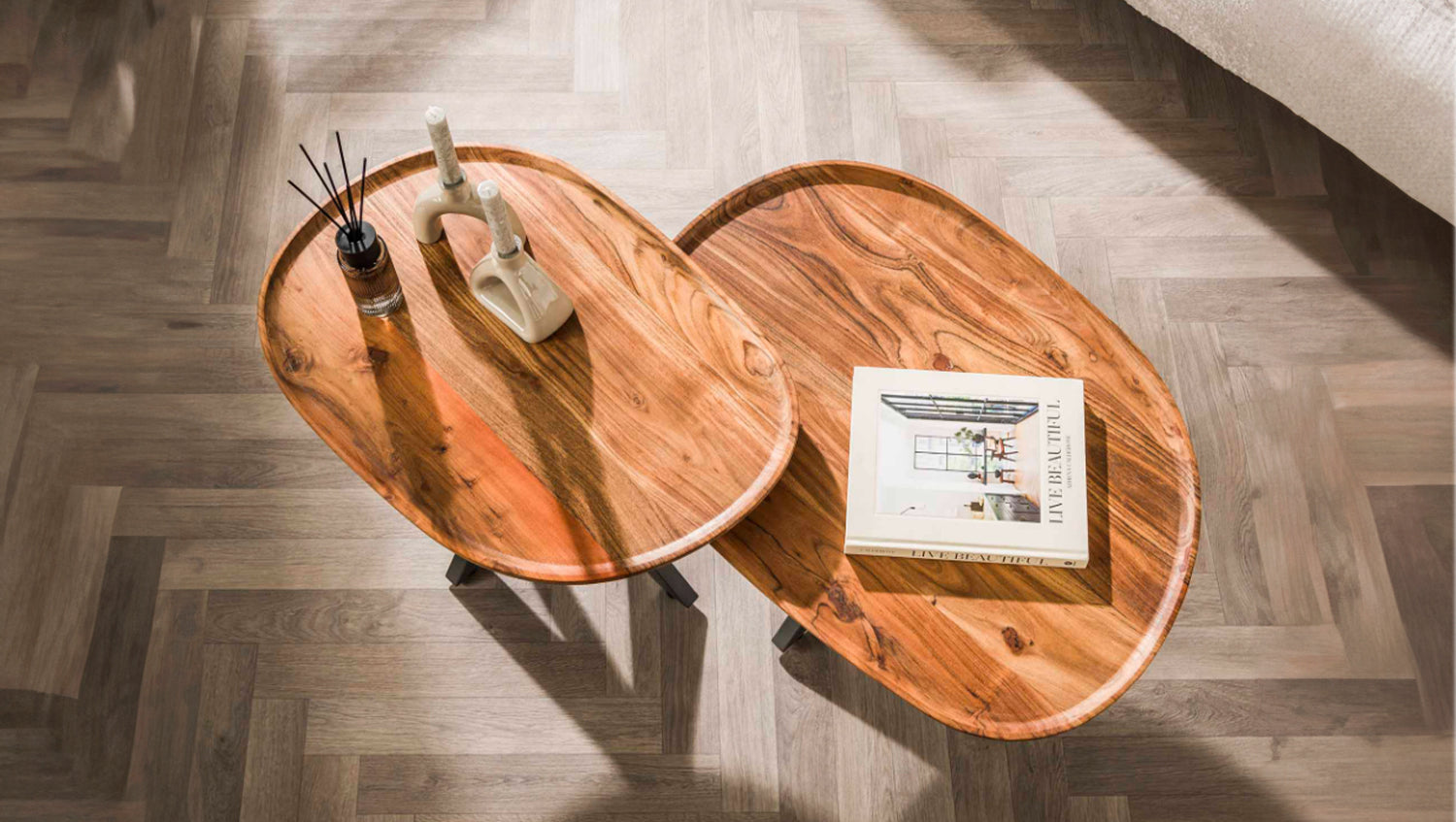 Das schöne Couchtisch-Set RUBY von KAWOLA ist aus massivem Akazienholz gefertigt. Es wurde eine organisch geformte Platte mit erhöhtem Rand und ein Spinnengestell gewählt - ein echter Blickfang! Das Set besteht aus zwei Tischen, die flexibel kombiniert werden können. Der größte Tisch hat eine Fläche von 70 x 48 cm und eine Höhe von 45 cm, der kleinere Tisch hat eine Fläche von 57 x 80 cm und eine Höhe von 41 cm. Ob im modernen Loft, im gemütlichen Wohnzimmer oder in einer eleganten Lounge – das Couchtisch-Set RUBY setzt stilvolle Akzente und verbindet Funktionalität mit zeitloser Ästhetik.