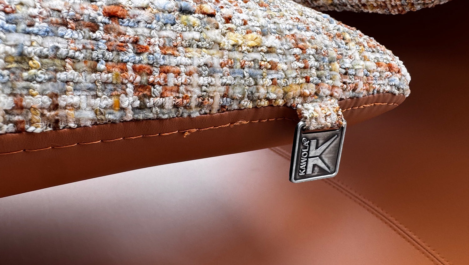 Die Vorderseite ist mit einem hochwertigen Strukturstoff in Melange-Optik bezogen. Das mehrfarbige Gewebe spielt mit warmen Naturtönen und sorgt für Tiefe und Lebendigkeit. Die Rückseite ist in glattes Kunstleder eingefasst – ein spannender Kontrast, der HAZEL seinen markanten Look verleiht.