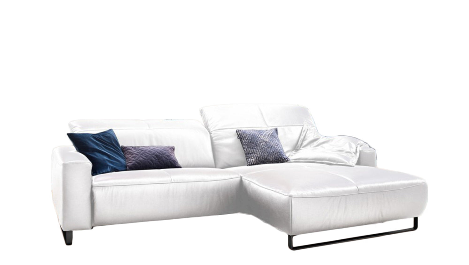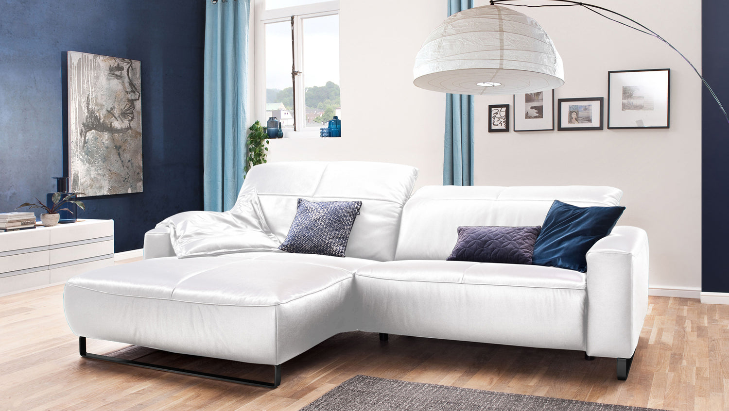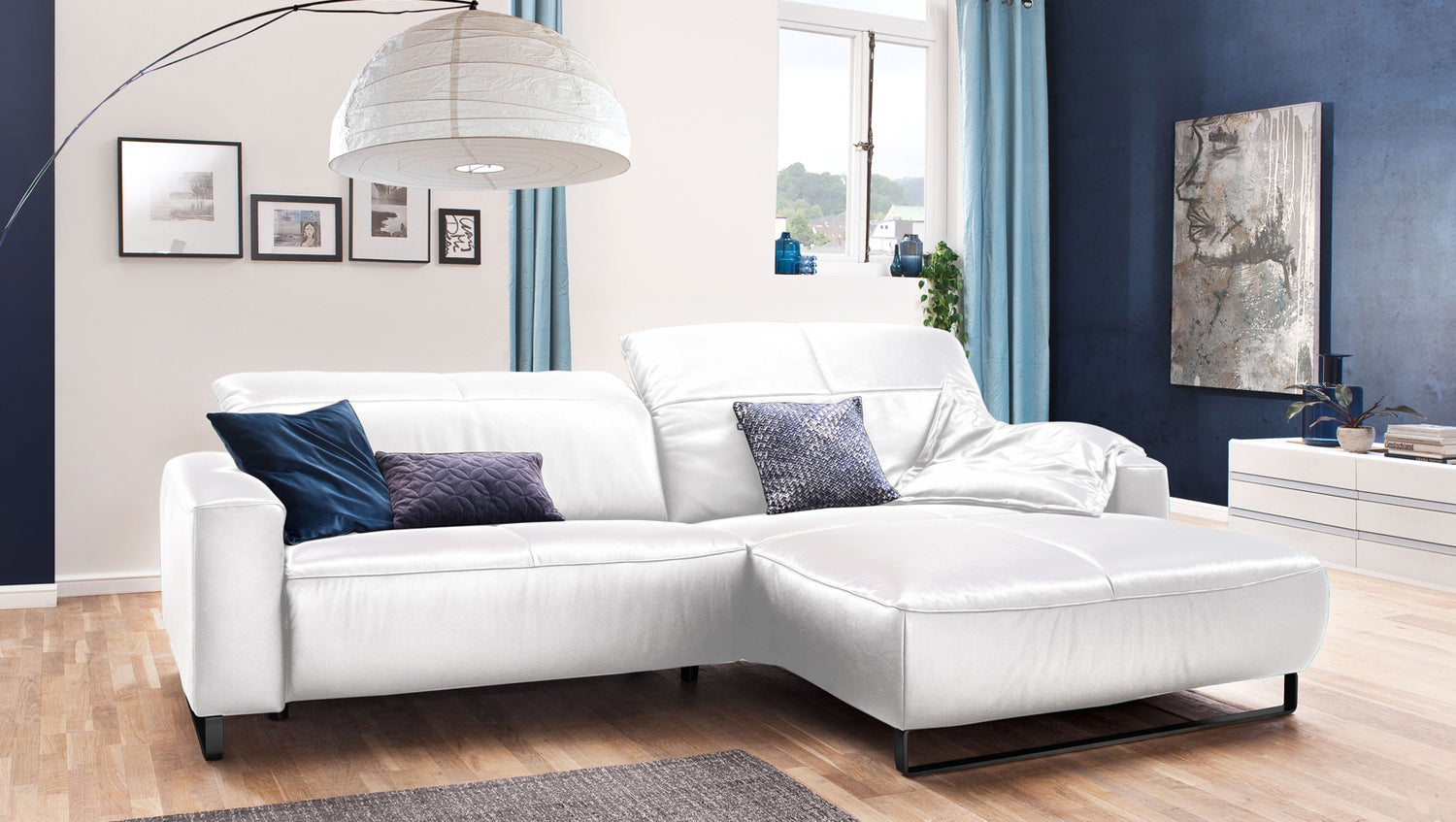 Die hier ausgewählte Bezugsfarbe Life-line white passt hervorragend zur Lederauswahl und zum Design des Ledersofas.