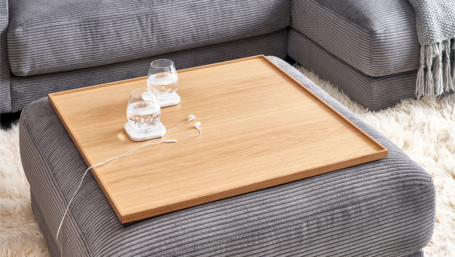 Dank seiner Größe und Form eignet es sich wunderbar als Auflage für den Big Hocker MADELINE und bleibt sicher an Ort und Stelle, ohne zu verrutschen. Funktionieren Sie Ihren Hocker ganz einfach zum Couchtisch oder Beistelltisch um. So können Sie sich ganz bequem zurücklehnen und Ihre Snacks in Reichweite haben.
