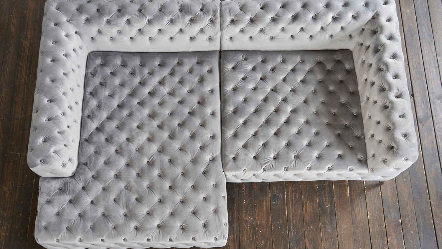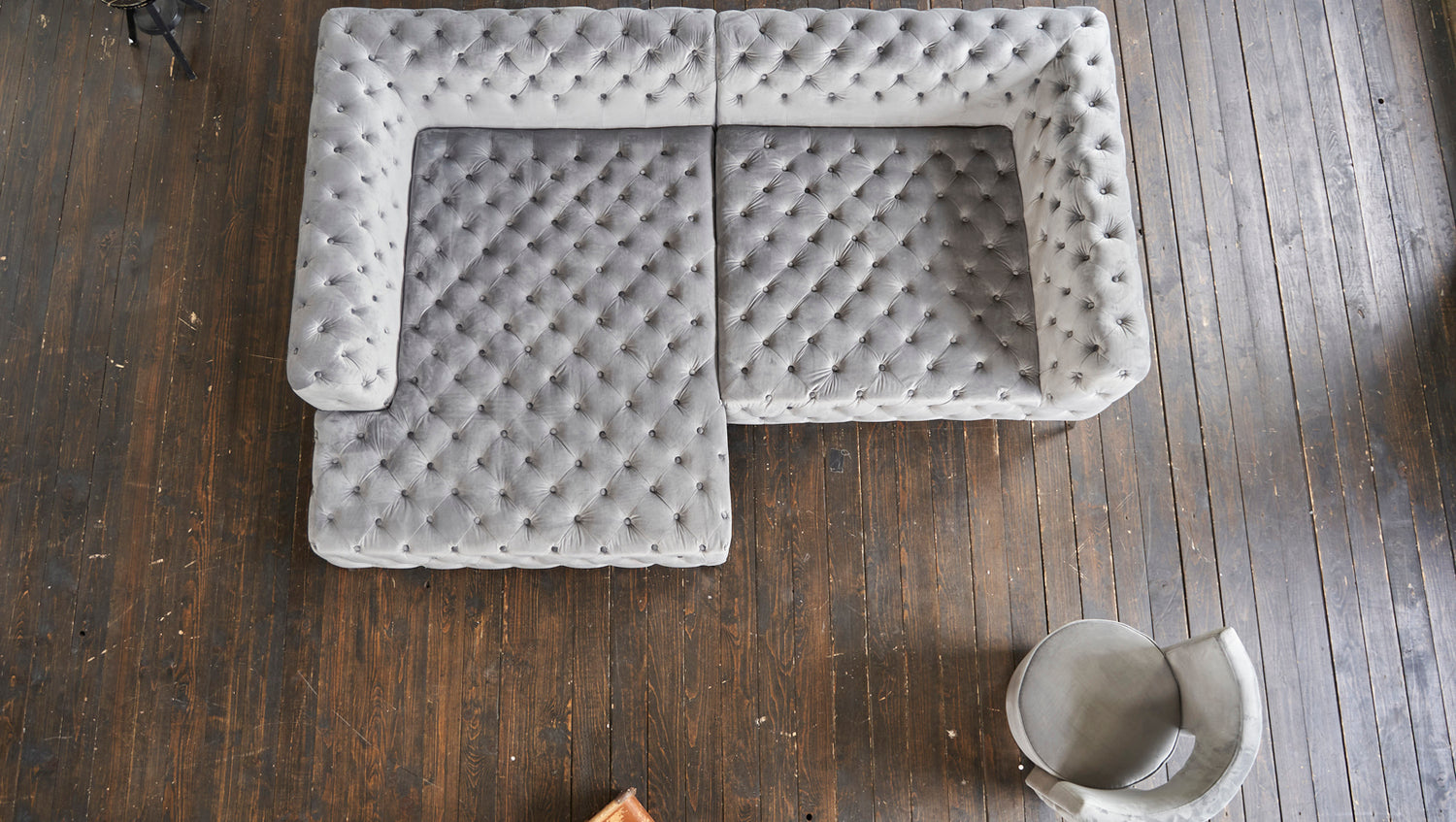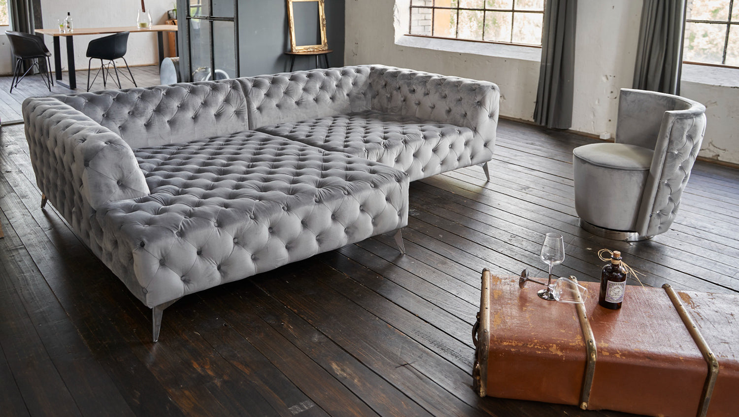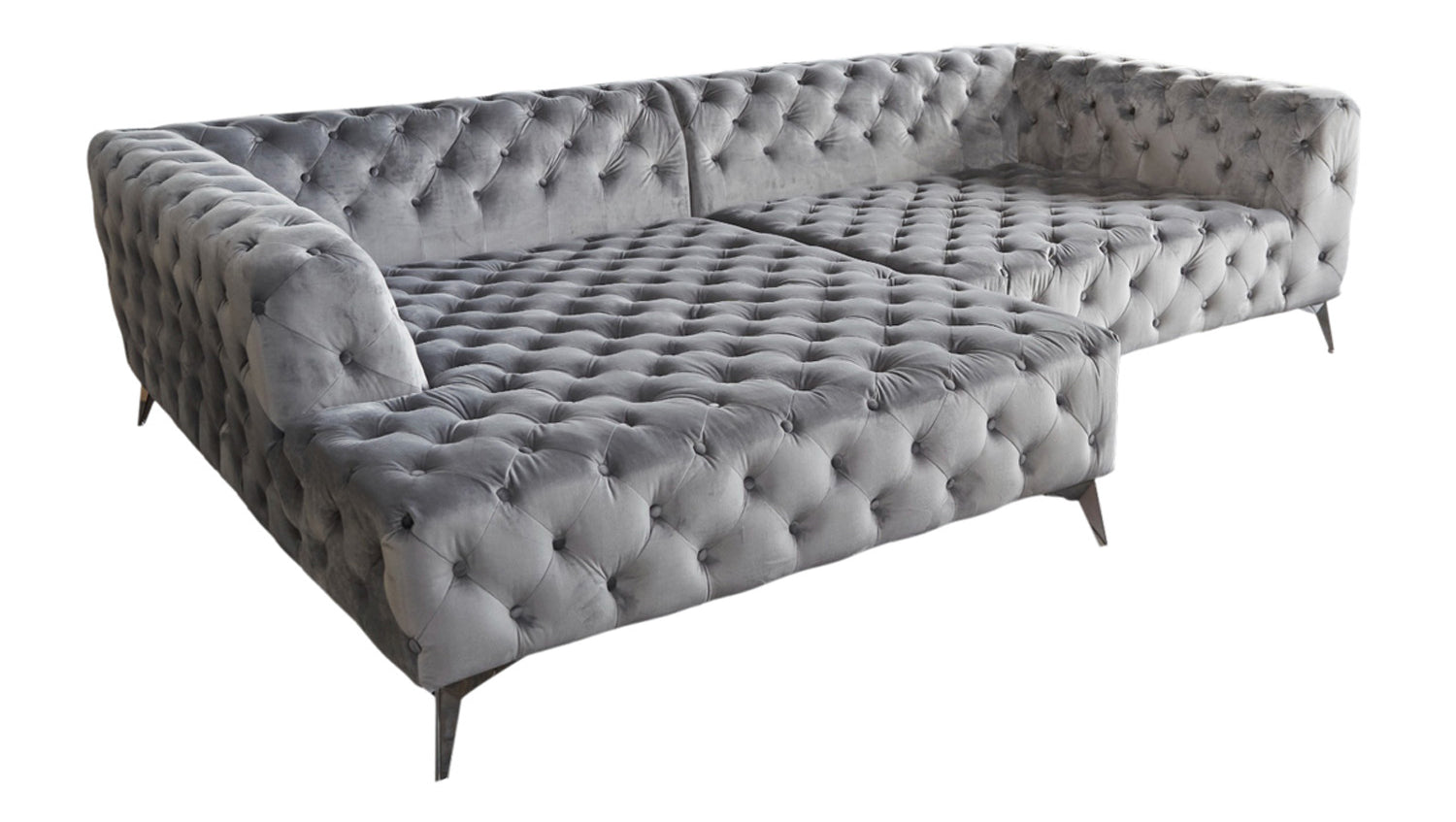 KAWOLA Sofa NARLA Ecksofa Chesterfield Stoff velvet silber Recamiere links
