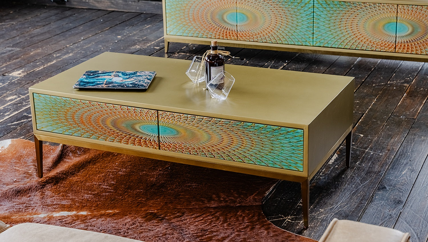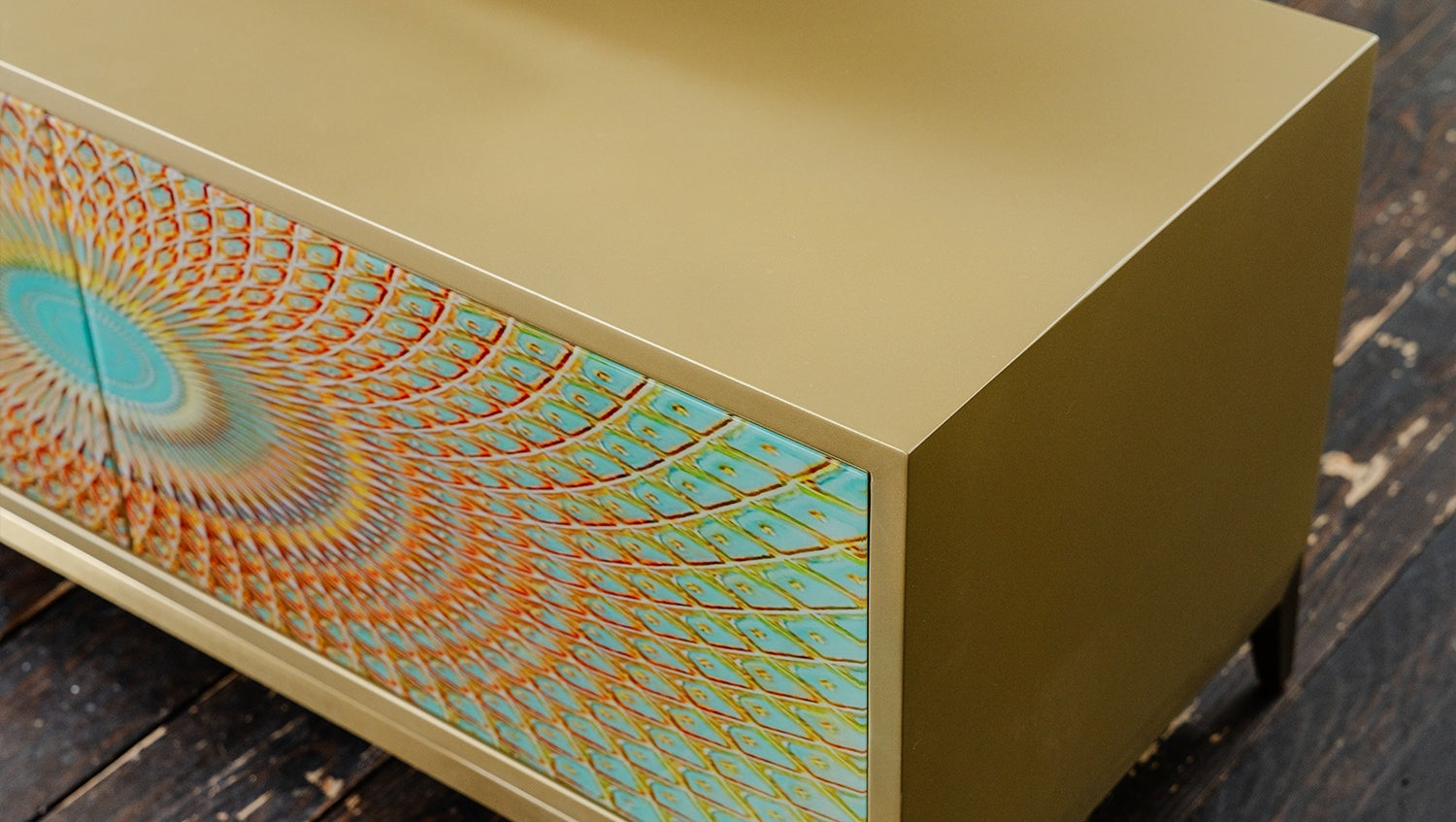 Das KAWOLA Lowboard LAGO besticht durch seine elegante Kombination aus ausgefallenem Design und praktischer Funktionalität. Mit seiner Breite von 200 cm ist es der ideale Platz für Ihren Fernseher. Die Türen sind mit Hartglas beschichtet und weisen goldfarbene Verzierungen auf, die die Form eines Pfauenauges ergeben. Die vier Türen bieten großzügigen Stauraum und lassen sich dank des komfortablen Push-to-Open-Mechanismus mühelos öffnen. Die goldfarbenen Füße aus gebürstetem Edelstahl sorgen für einen modernen, zeitlosen Look und bieten gleichzeitig stabile Standfestigkeit. Das TV-Board LAGO von KAWOLA fügt sich perfekt in jedes Wohnambiente ein und ist ideal für Liebhaber von außergewöhnlichen, eleganten Möbelstücken. Entdecken Sie die perfekte Kombination aus Design und Funktionalität mit dem Lowboard LAGO!