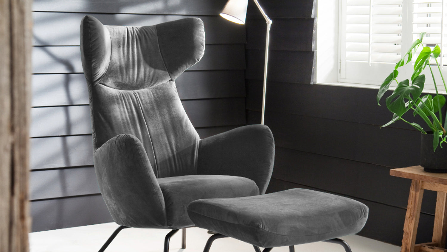 KAWOLA Sessel LOTTE Ohrensessel velvet stone mit Hocker