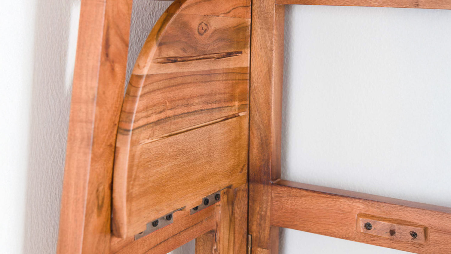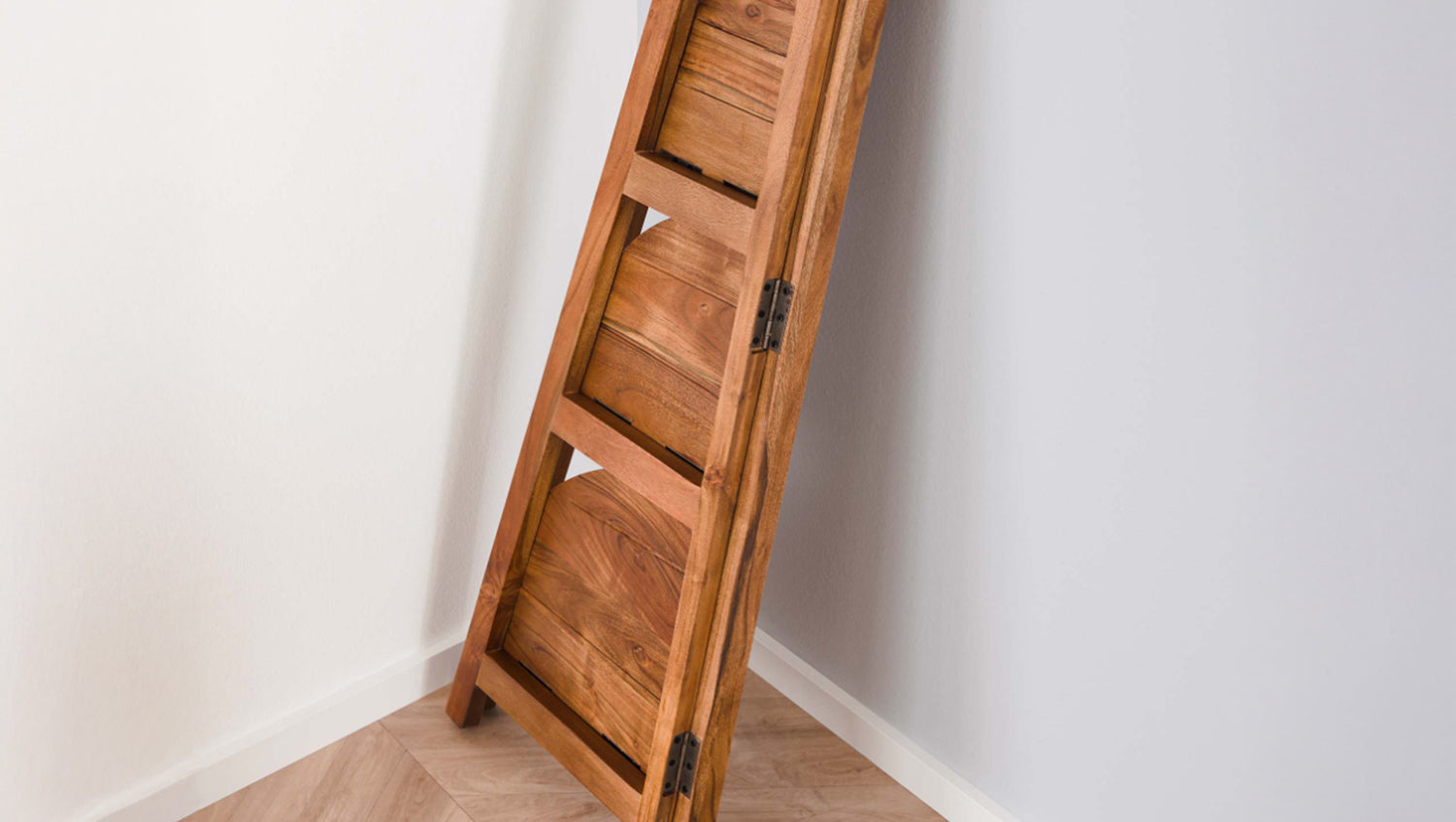 Ein besonderes Highlight: Die Regalböden sind mit Scharnieren versehen und lassen sich bei Bedarf hochklappen. Dadurch kann das Regal platzsparend verpackt und einfach transportiert werden.