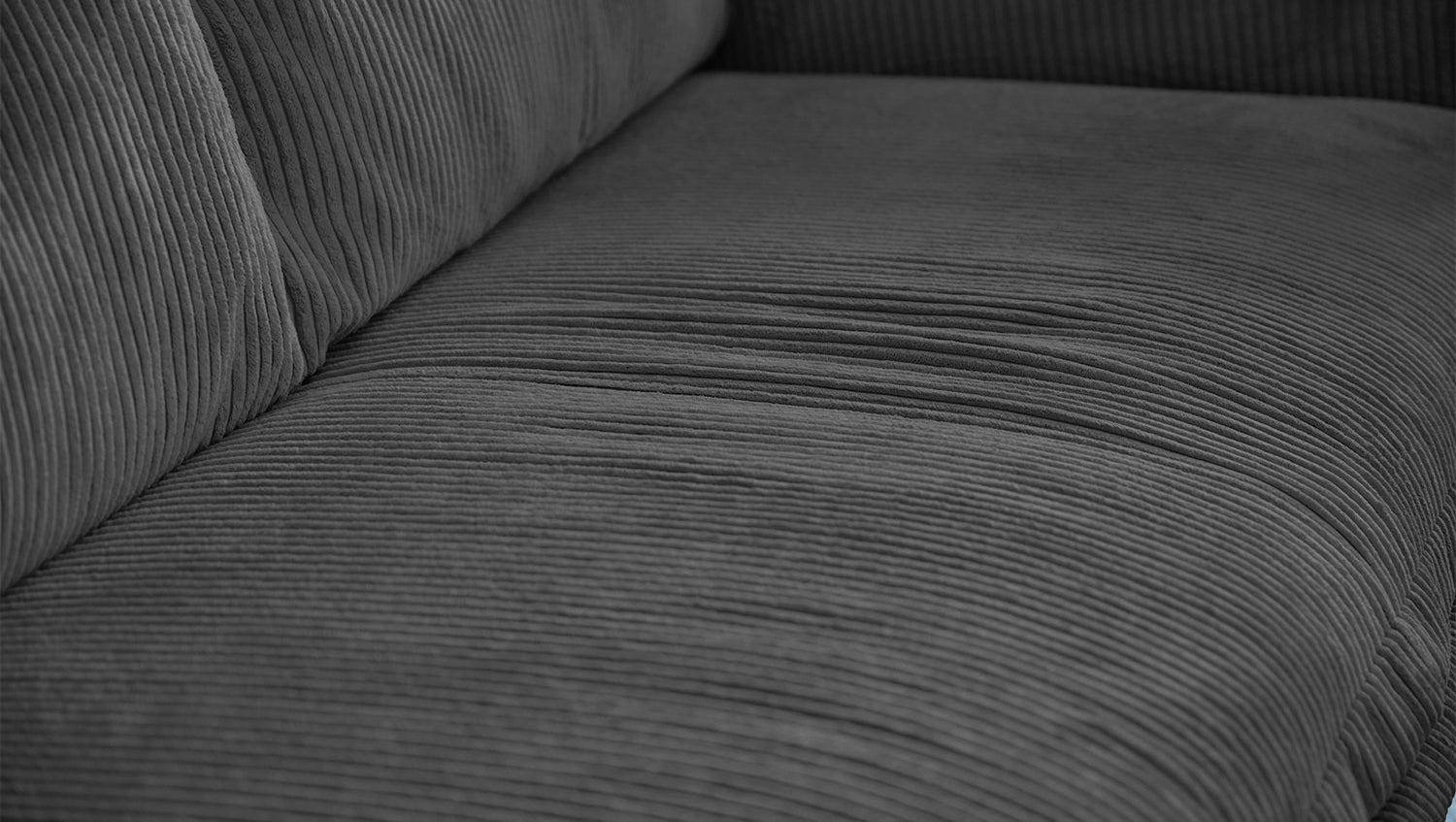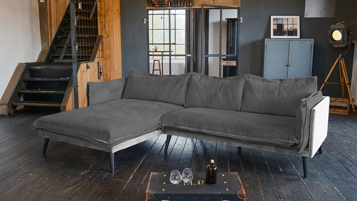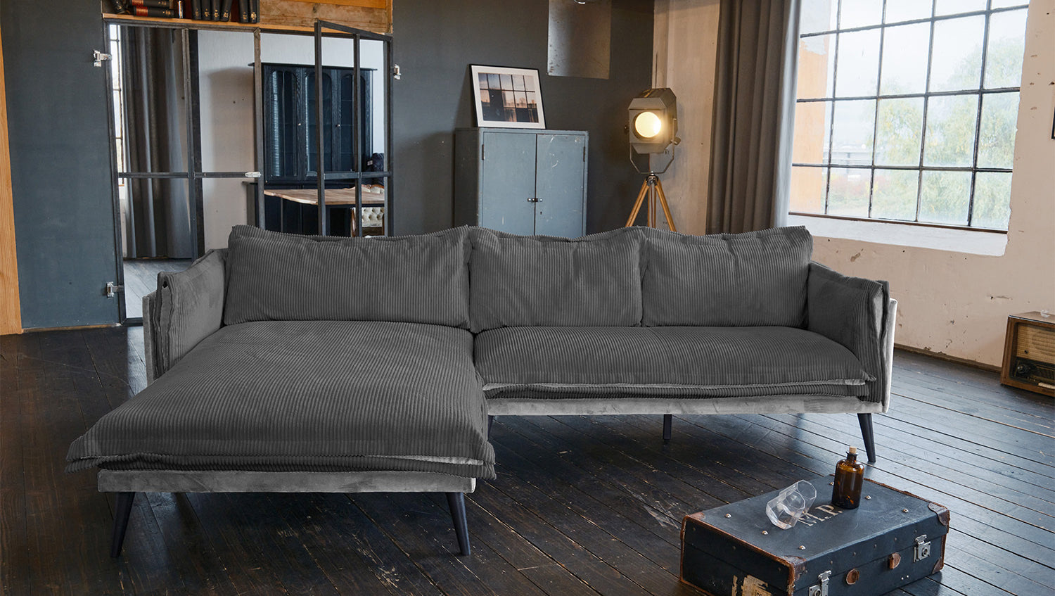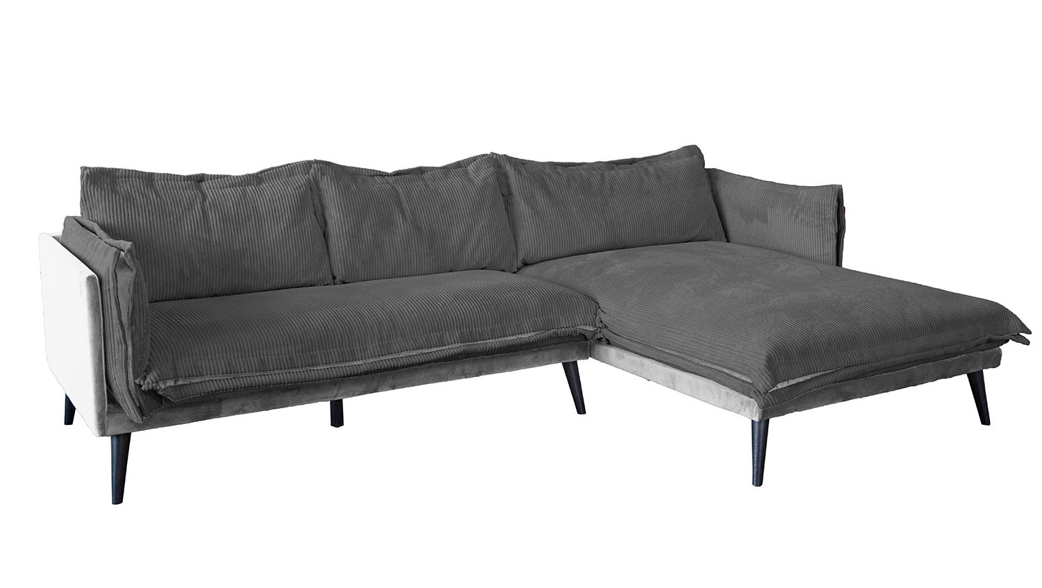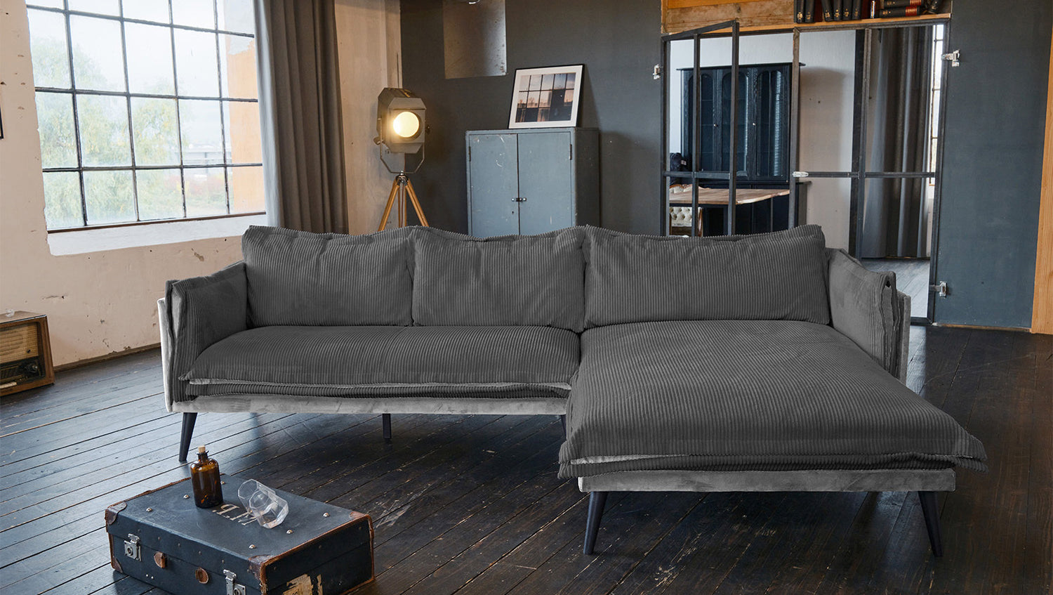 KAWOLA Sofa QUENYA Ecksofa Cord dunkelgrau / Velvet silber