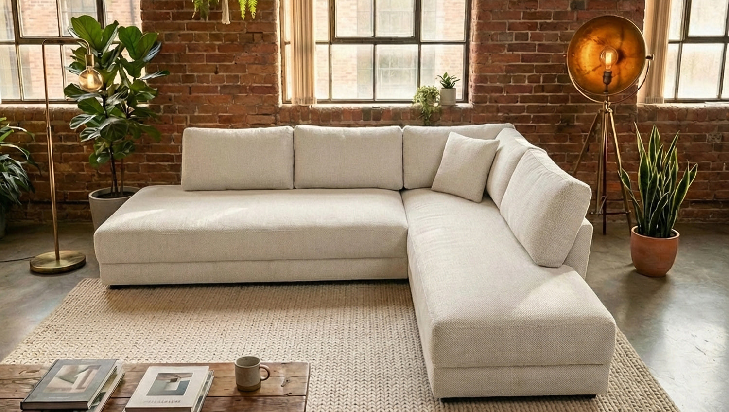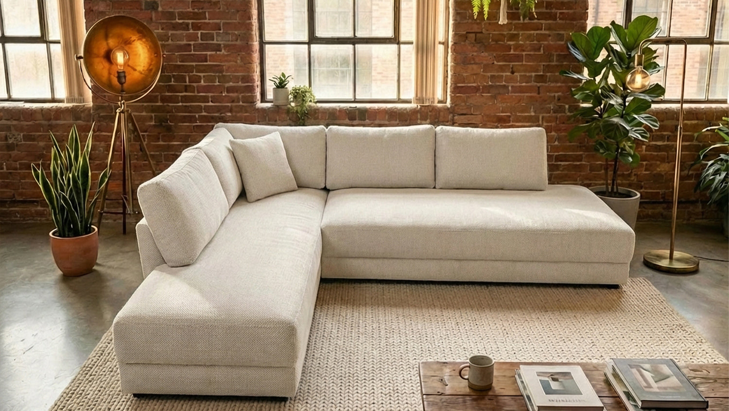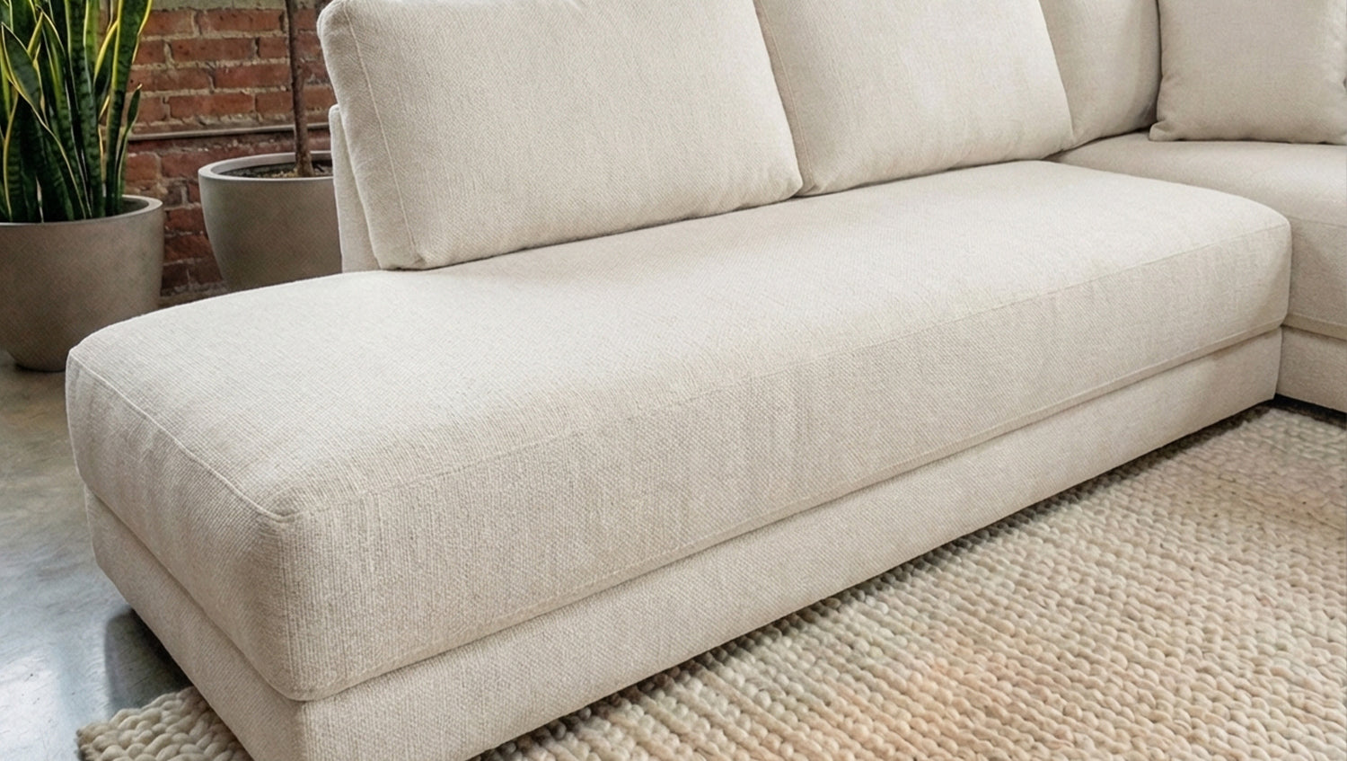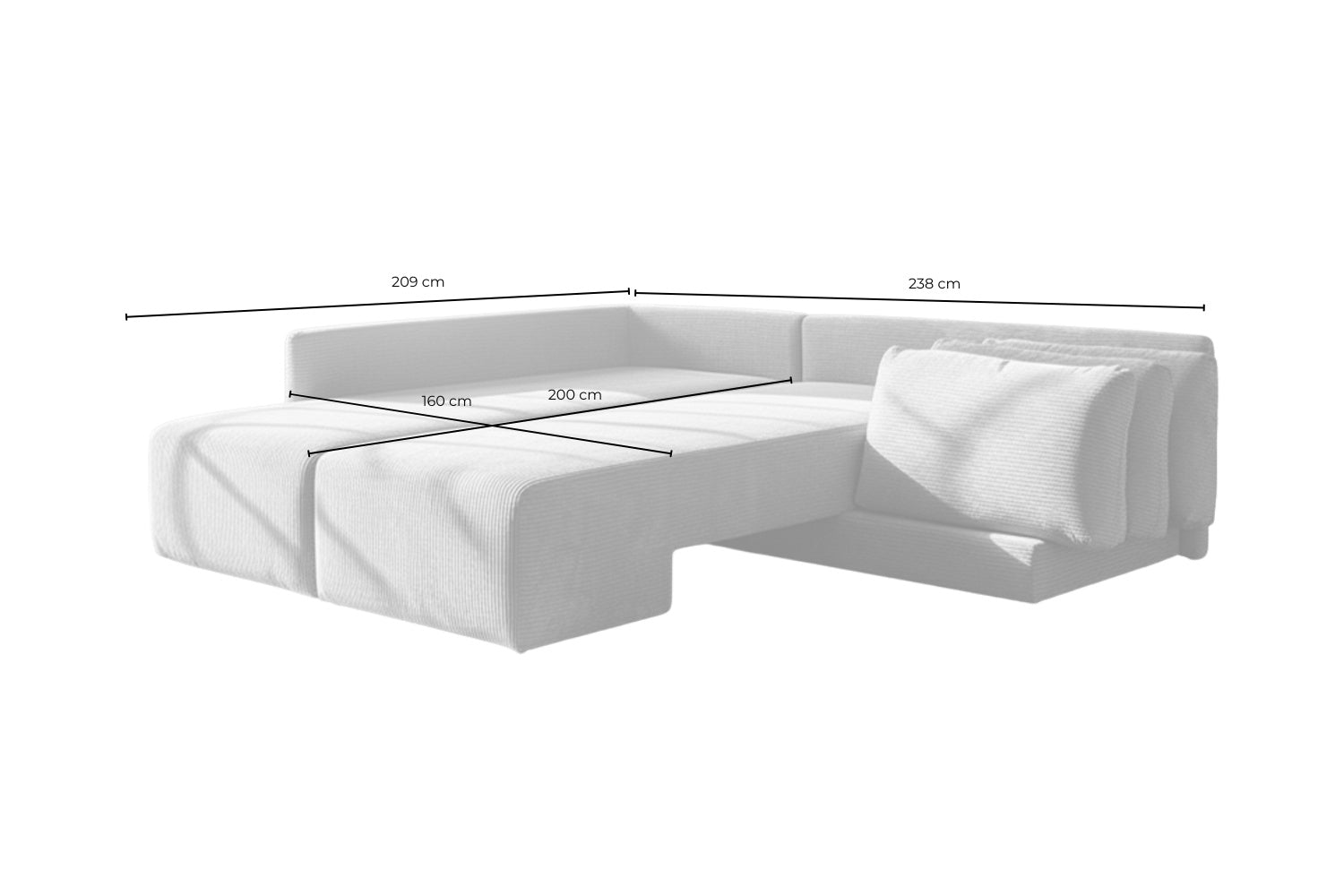 Auch bei dieser Ausführung sind insgesamt sechs Kissen im Lieferumfang enthalten, darunter zwei Schlafkissen, die den Schlafkomfort zusätzlich erhöhen und das Sofa funktional abrunden. Mit einer Gesamtbreite von 288 cm und einer Ottomane von 209 cm bietet SADIRA großzügige Flächen zum Sitzen und Liegen. Die Rückenlehnenhöhe von 89 cm sorgt für eine angenehme Sitzhaltung und zusätzlichen Komfort.